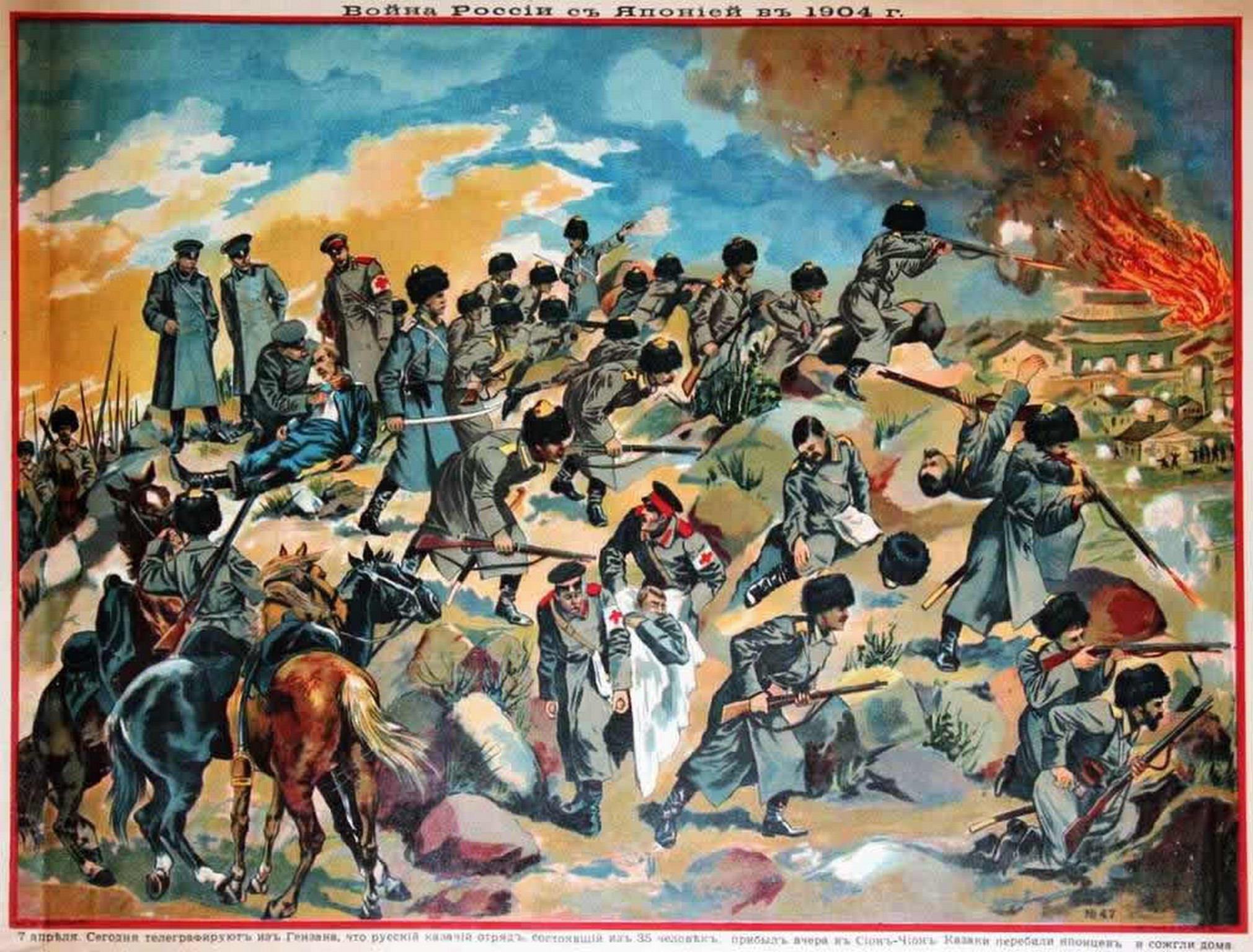 1904 April 7. Today they telegraphed from Genzan that a Russian Cossack detachment, consisting of 35 people, arrived yesterday at Slong-Chong