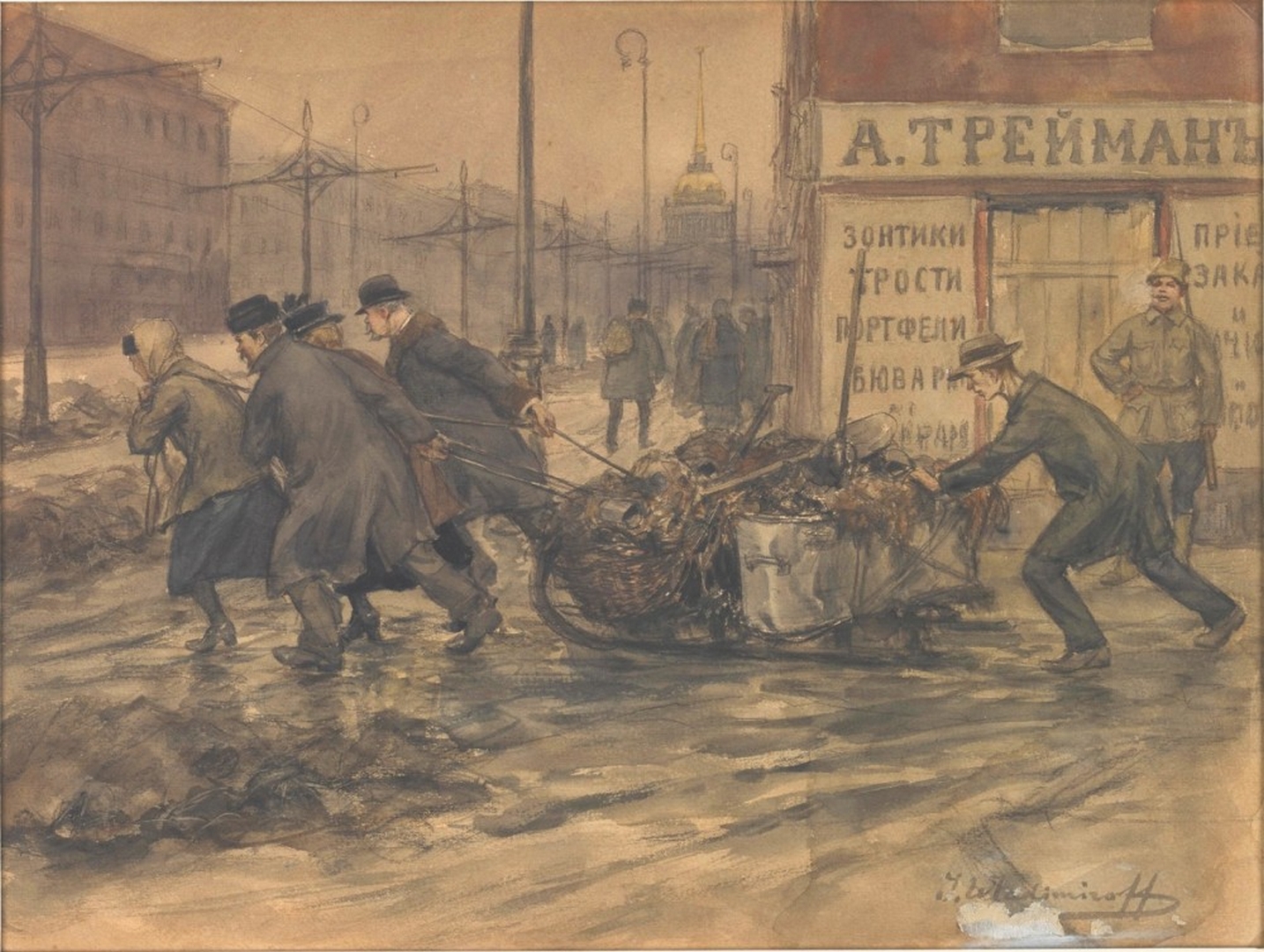 Rich merchants and Russian noblemen set to pulling out rubbish from yards (1920) by Ivan Vladimirov