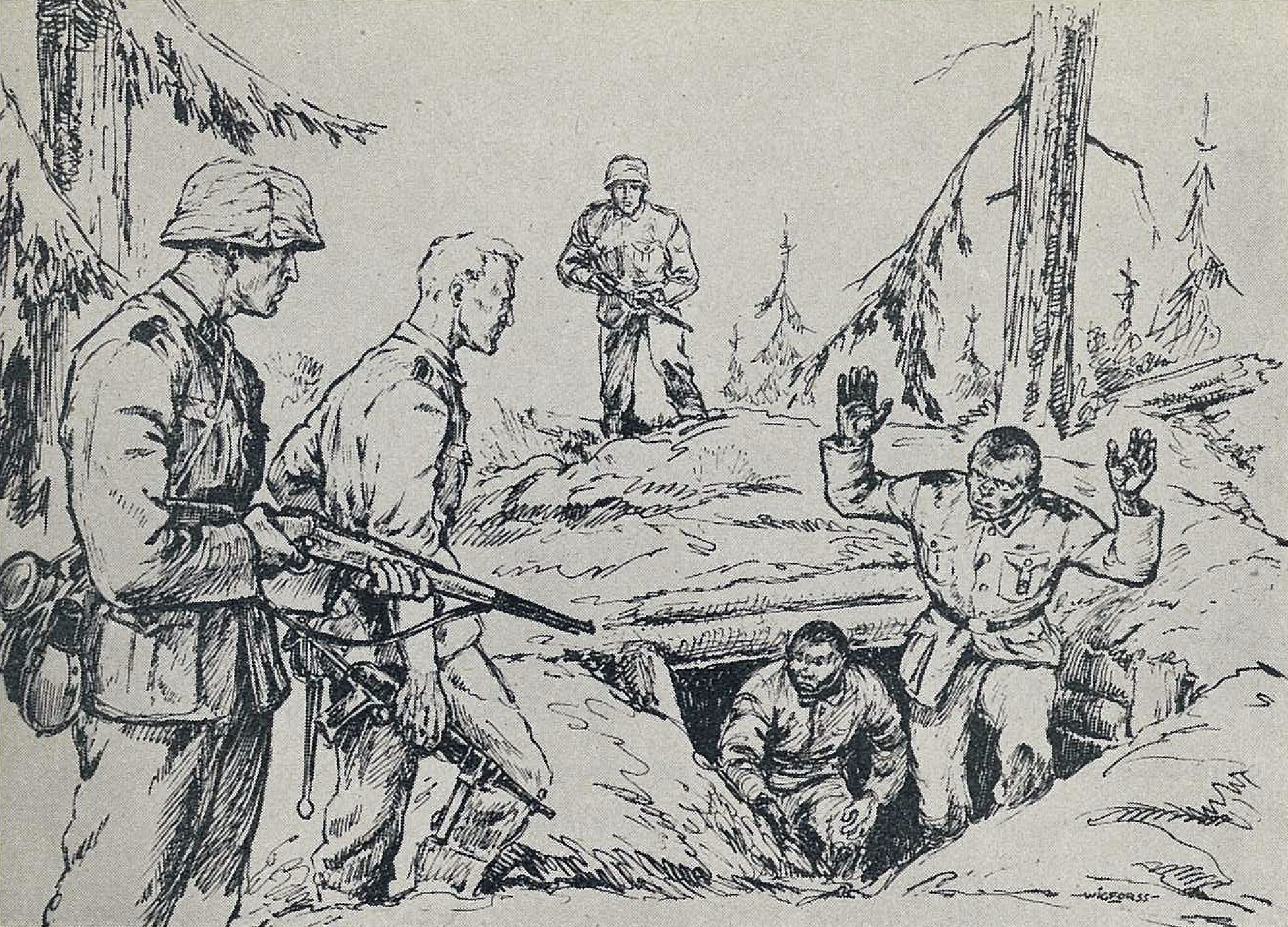Enemy bunker is stormed. They come up in German uniforms