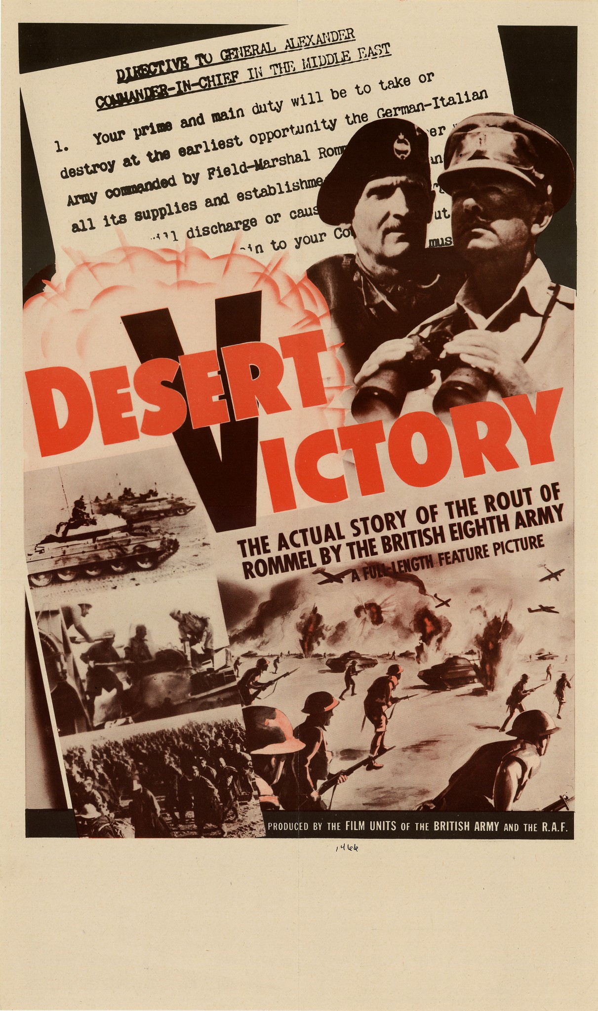 Desert victory : the actual story of the rout of Rommel by the British Eighth Army : a full-length feature picture., poster, Date Unknown; (digital.library.unt.edu/ark:/67531/metadc465/m1/1/: accessed November 26, 2024), University of North Texas Libraries, UNT Digital Library, digital.library.unt.edu; crediting UNT Libraries Government Documents Department.