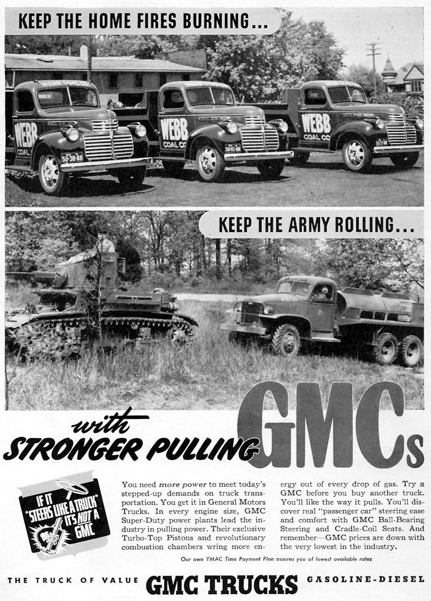 1942 GMC Trucks. Keep The Home Fires Burning… Keep The Army Rolling… with Stronger Pulling GMCs