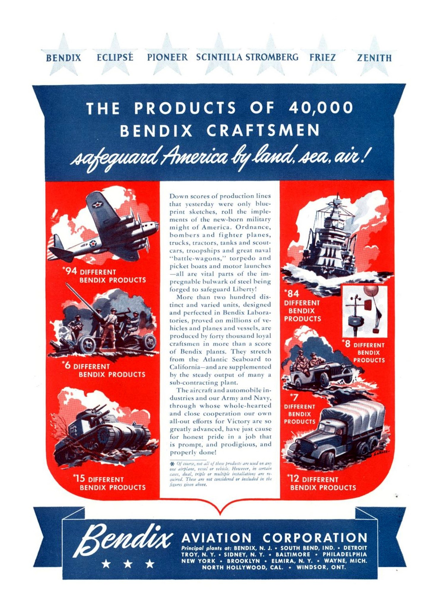 Main » 1939-1945 World War II » WW2 USA Gear and Vehicles Propaganda Collection » 1942 The Products Of 40,000 Bendix Craftsmen safeguard America by land, sea, air!