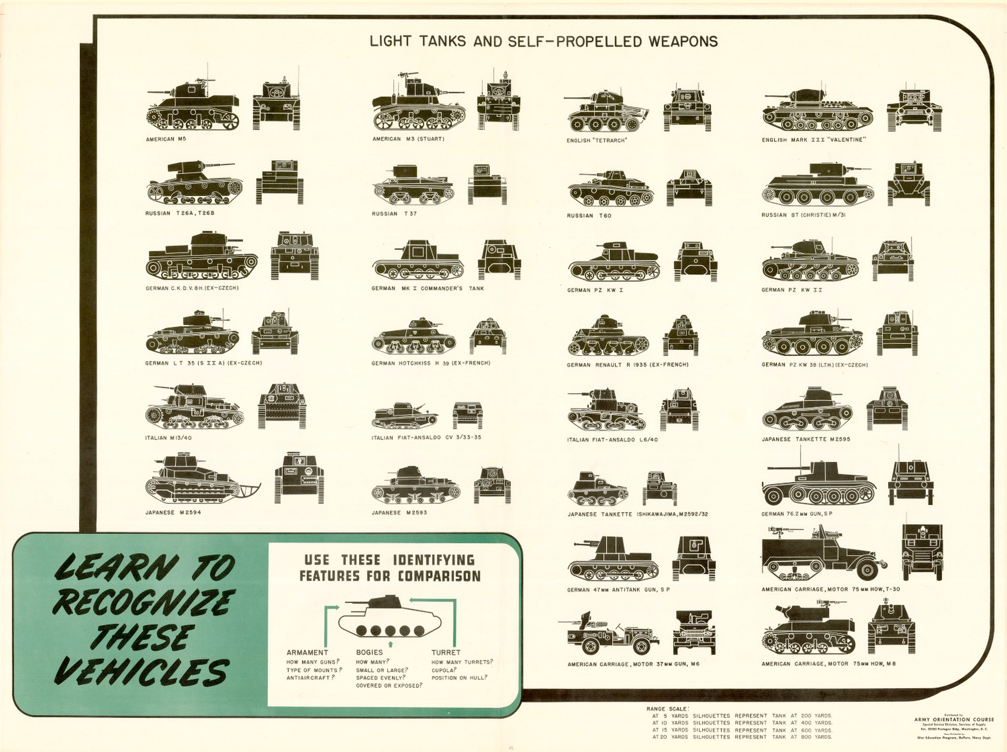 United States. Army. Services of Supply. Special Service Division. Learn to recognize these vehicles : light tanks and self-propelled weapons., poster, 1943; Washington, D.C.. (digital.library.unt.edu/ark:/67531/metadc510/m1/1/: accessed November 28, 2024), University of North Texas Libraries, UNT Digital Library, digital.library.unt.edu; crediting UNT Libraries Government Documents Department.