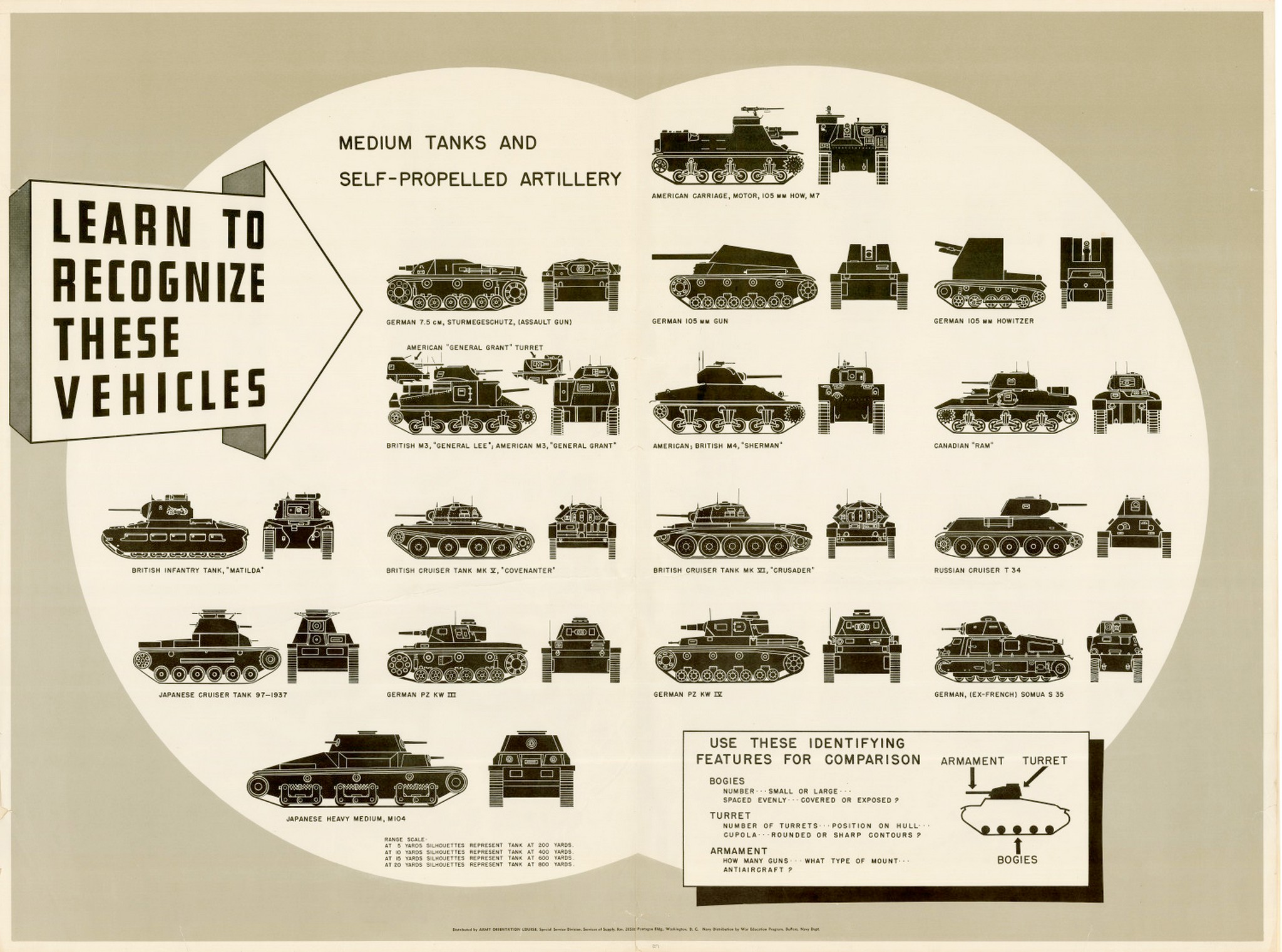 United States. Army. Services of Supply. Special Service Division. Learn to recognize these vehicles : medium tanks and self-propelled artillery., poster, 1943; Washington, D.C.. (digital.library.unt.edu/ark:/67531/metadc507/m1/1/: accessed November 28, 2024), University of North Texas Libraries, UNT Digital Library, digital.library.unt.edu; crediting UNT Libraries Government Documents Department.