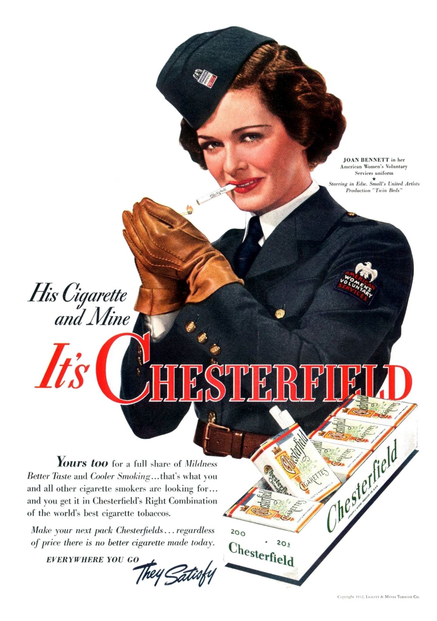 Main » 1939-1945 World War II » WW2 USA Home Front Posters Collection » 1942 Joan Bennett. His Cigarette and Mine. It’s Chesterfield