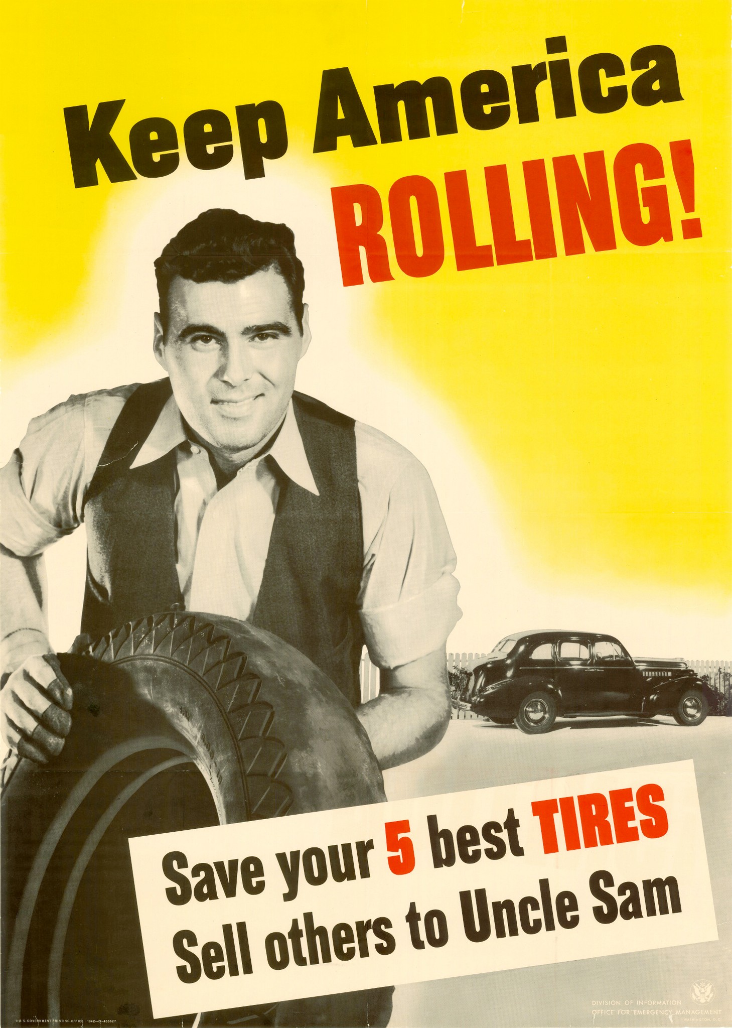 United States. Office for Emergency Management. Division of Information. Keep America rolling! : save your 5 best tires, sell others to Uncle Sam., poster, 1942; [Washington D.C.]. (digital.library.unt.edu/ark:/67531/metadc511/m1/1/: accessed November 27, 2024), University of North Texas Libraries, UNT Digital Library, digital.library.unt.edu; crediting UNT Libraries Government Documents Department.