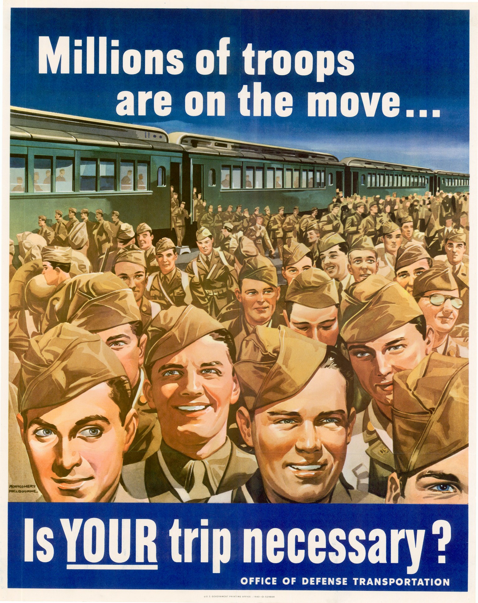 Melbourne, Montgomery. Millions of troops are on the move– : is your trip necessary?, poster, 1943; [Washington, D.C.]. (digital.library.unt.edu/ark:/67531/metadc358/m1/1/: accessed November 29, 2024), University of North Texas Libraries, UNT Digital Library, digital.library.unt.edu; crediting UNT Libraries Government Documents Department.