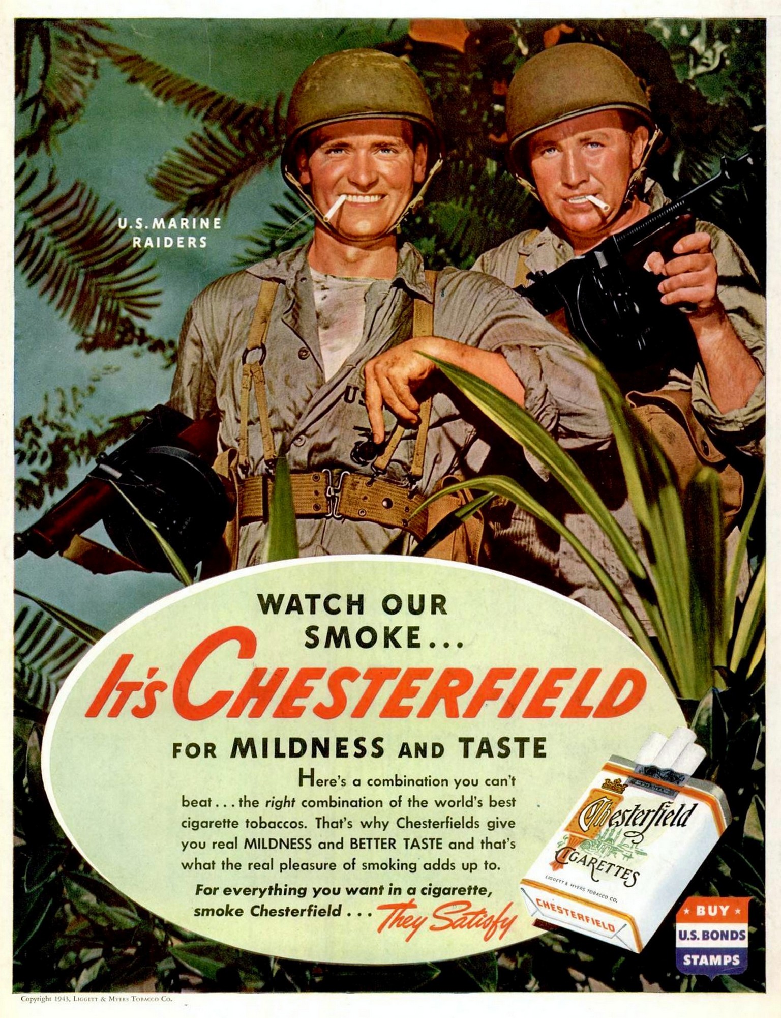 1943 U.S. Marine Raiders, Watch Our Smoke …. It’s Chesterfield For Mildness And Taste