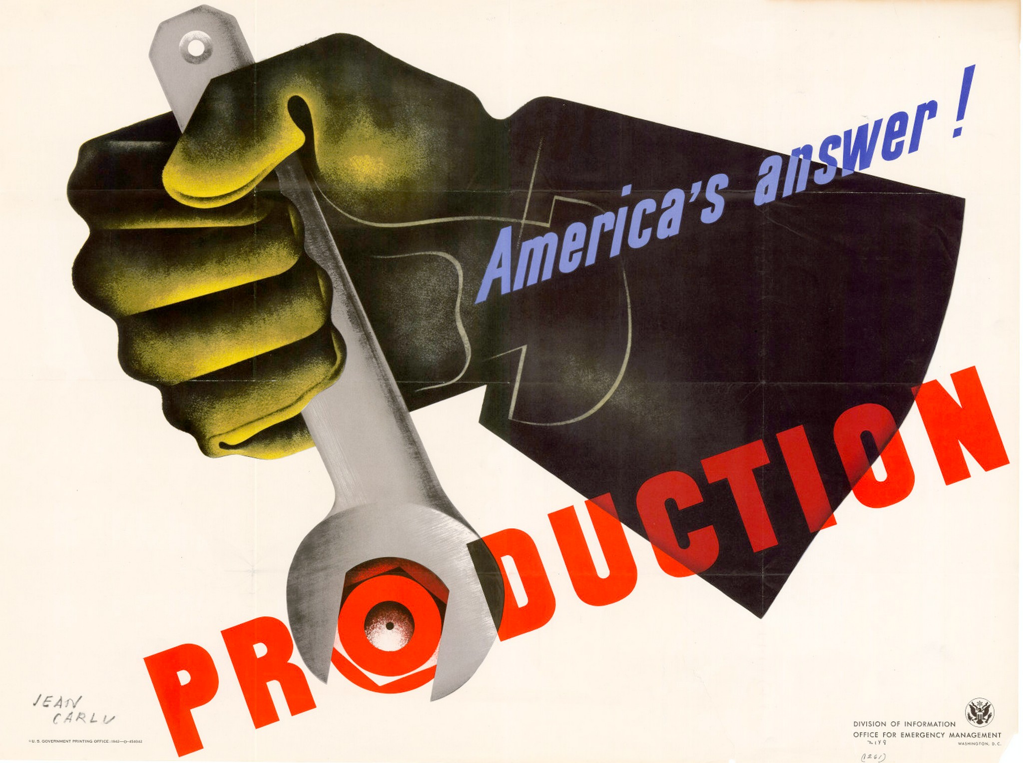 Carlu, Jean. America’s answer! : production., poster, 1942; Washington D.C.. (digital.library.unt.edu/ark:/67531/metadc575/m1/1/: accessed November 25, 2024), University of North Texas Libraries, UNT Digital Library, digital.library.unt.edu; crediting UNT Libraries Government Documents Department.