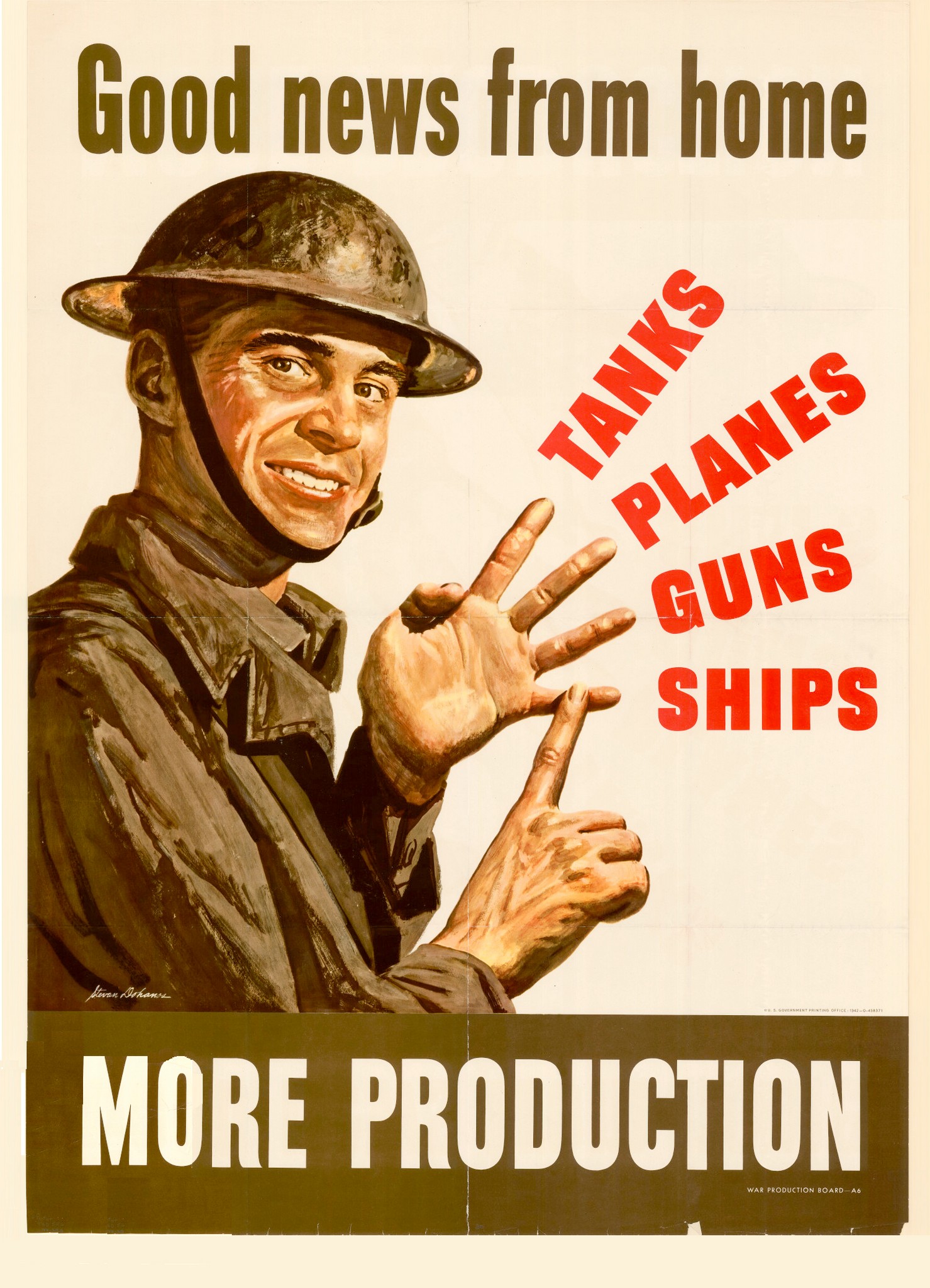1942 Good news from home. Tanks Planes Guns Ships. More Production