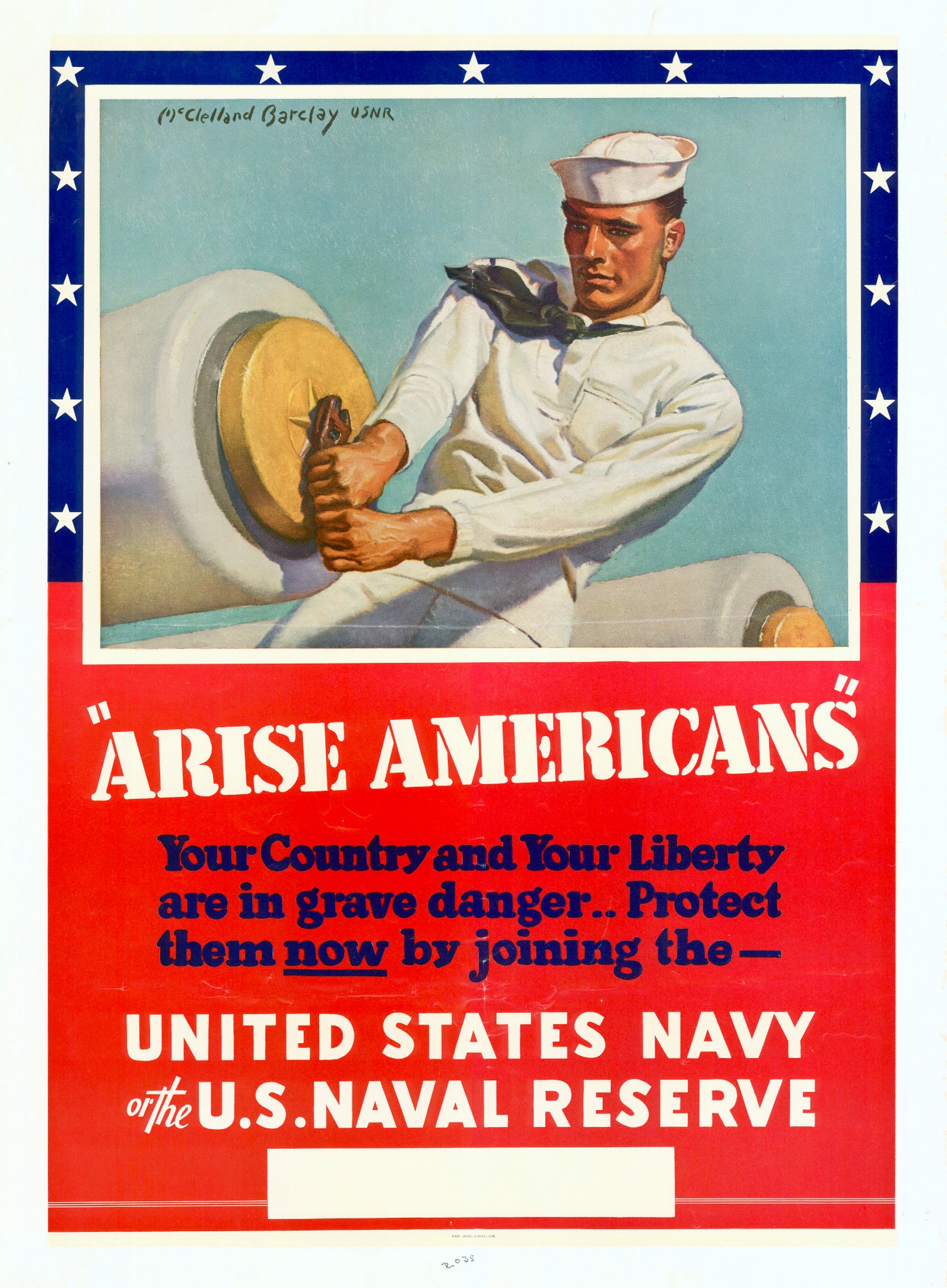 Barclay, McClelland. “Arise Americans” : your country and your liberty are in grave danger — protect them now by joining the– United States Navy or the U.S. Naval Reserve., poster, June 18, 1941; (digital.library.unt.edu/ark:/67531/metadc612/m1/1/: accessed March 18, 2017), University of North Texas Libraries, Digital Library, digital.library.unt.edu; crediting UNT Libraries Government Documents Department.