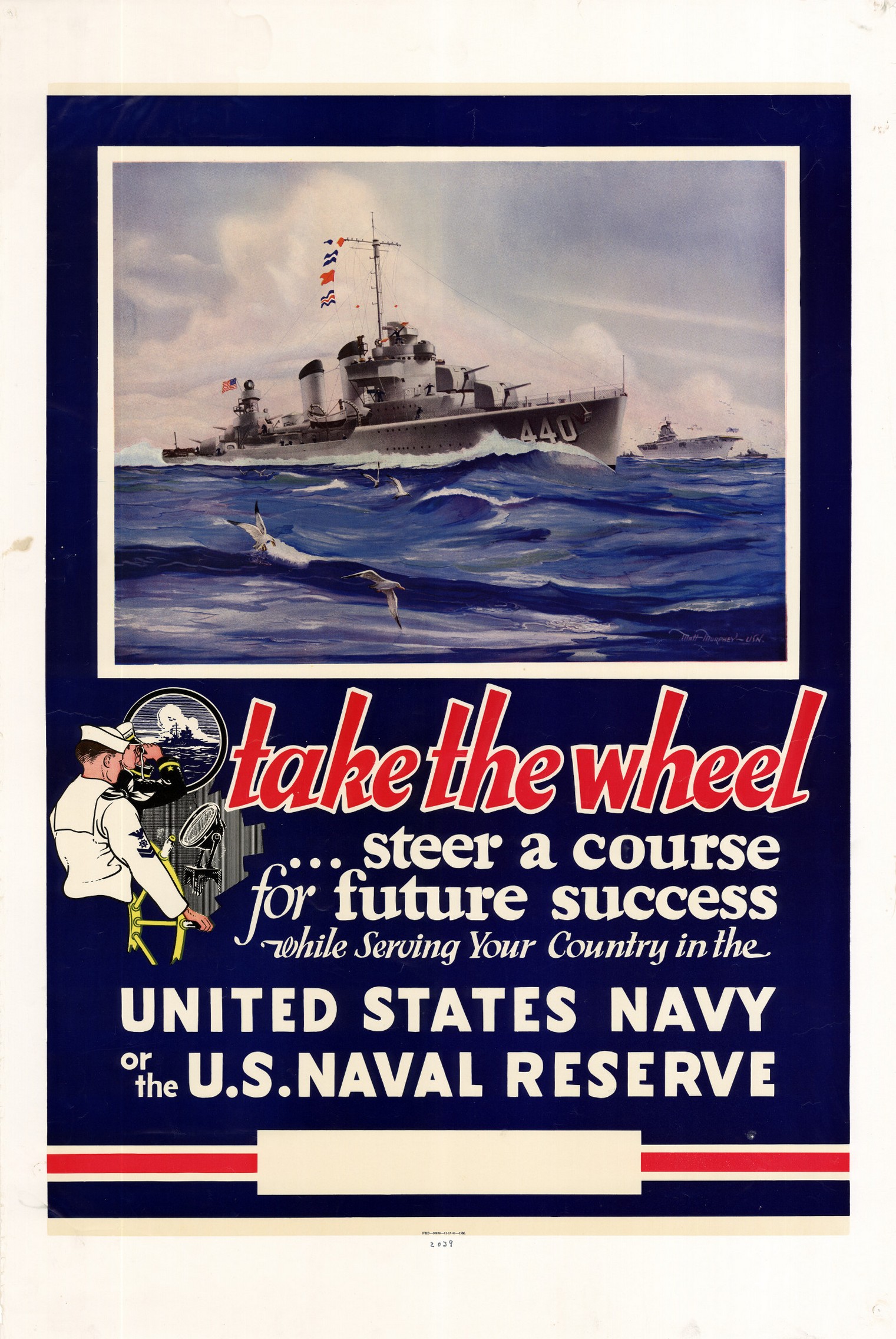 Murphey, Matt. Take the wheel : –steer a course for future success while serving your country in the United States Navy or the U.S. Naval Reserve., poster, 1941; (digital.library.unt.edu/ark:/67531/metadc142/m1/1/?q=take%20the%20wheel: accessed March 19, 2017), University of North Texas Libraries, Digital Library, digital.library.unt.edu; crediting UNT Libraries Government Documents Department.