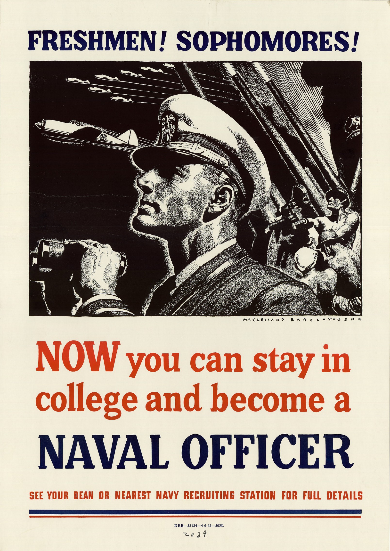 Barclay, McClelland. Freshmen! Sophomores! : now you can stay in college and become a naval officer., poster, 1942; (digital.library.unt.edu/ark:/67531/metadc602/m1/1/: accessed March 18, 2017), University of North Texas Libraries, Digital Library, digital.library.unt.edu; crediting UNT Libraries Government Documents Department.