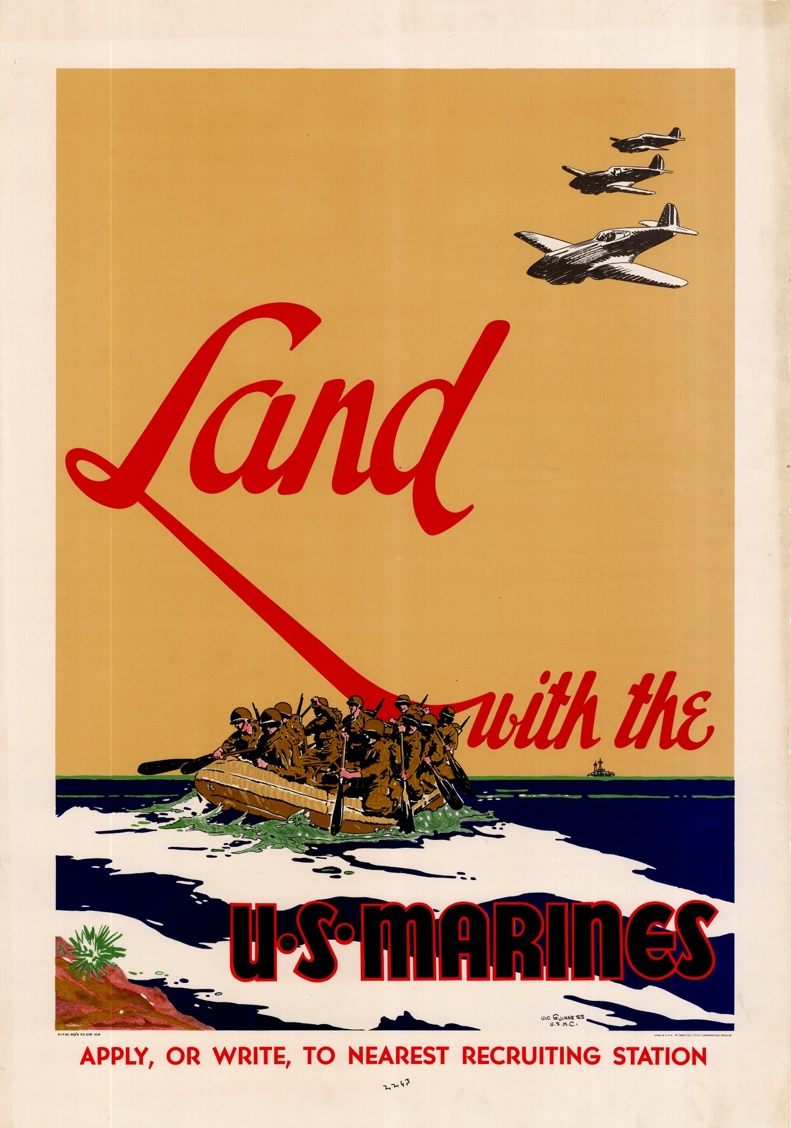 Guinness, Vic. Land with the U.S. Marines : apply, or write, to nearest recruiting station., poster, [1942]; Philadelphia, Pa.. (digital.library.unt.edu/ark:/67531/metadc286/m1/1/?q=Land%20with%20the%20U.S.%20Marines: accessed March 19, 2017), University of North Texas Libraries, Digital Library, digital.library.unt.edu; crediting UNT Libraries Government Documents Department.