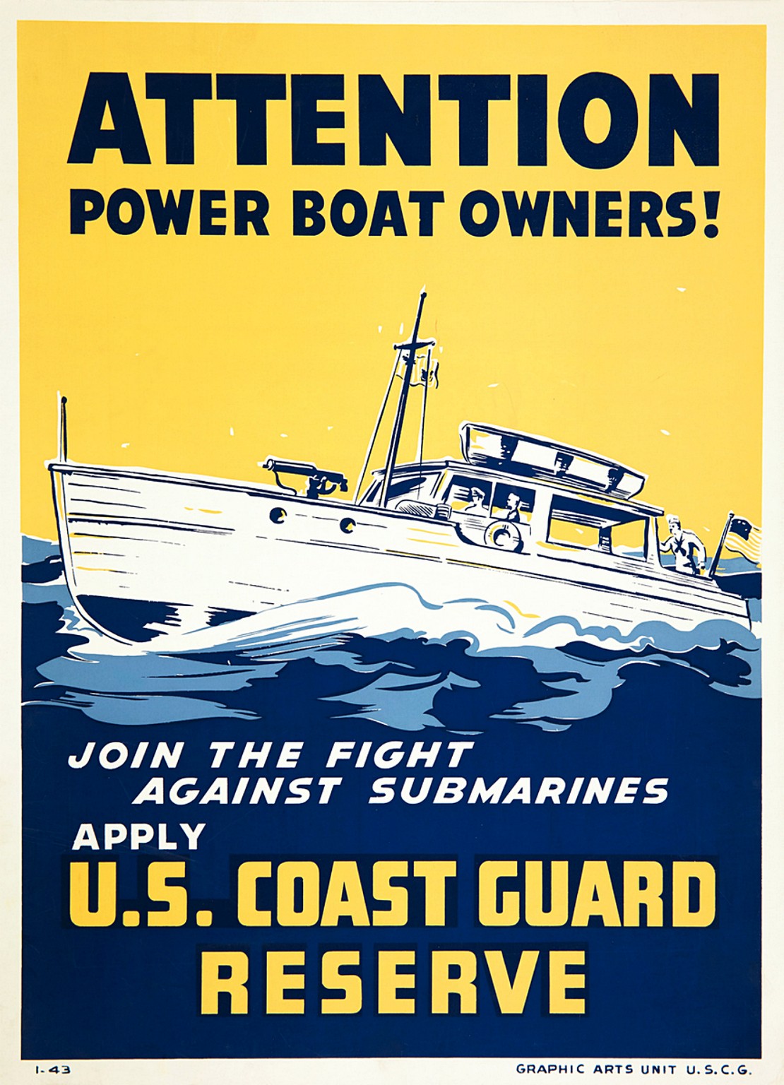 Main » 1939-1945 World War II » WW2 USA Recruiting Propaganda Collection » 1943 Attention Power Boat Owners! Join The Fight Against Submarines. Apply U.S. Coast Guard Reserve