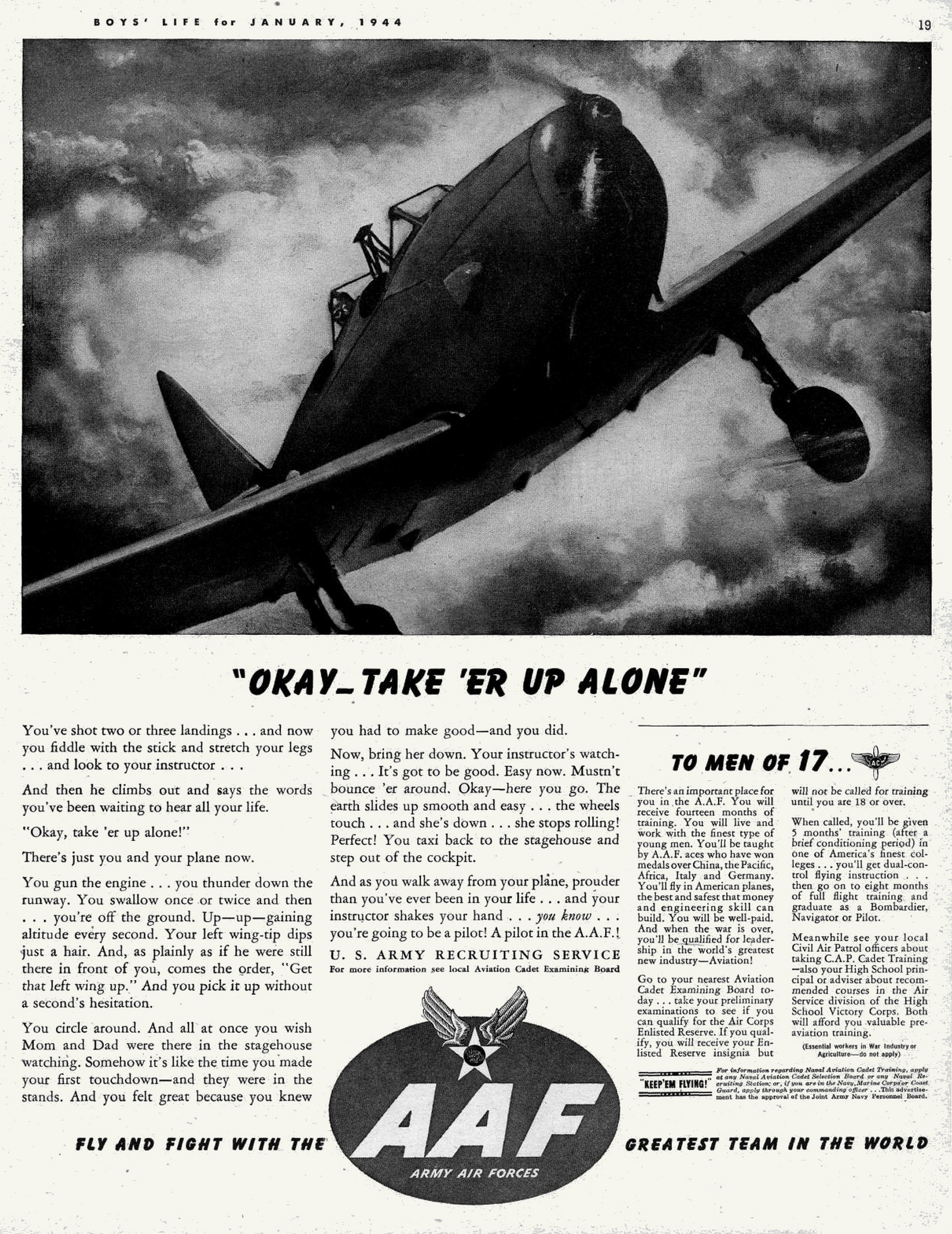 Main » 1939-1945 World War II » WW2 USA Recruiting Propaganda Collection » 1944 ‘Okay _ Take ‘Er Up Alone’ Fly And Fight With The AAF, Army Air Forces, Greatest Team In The World