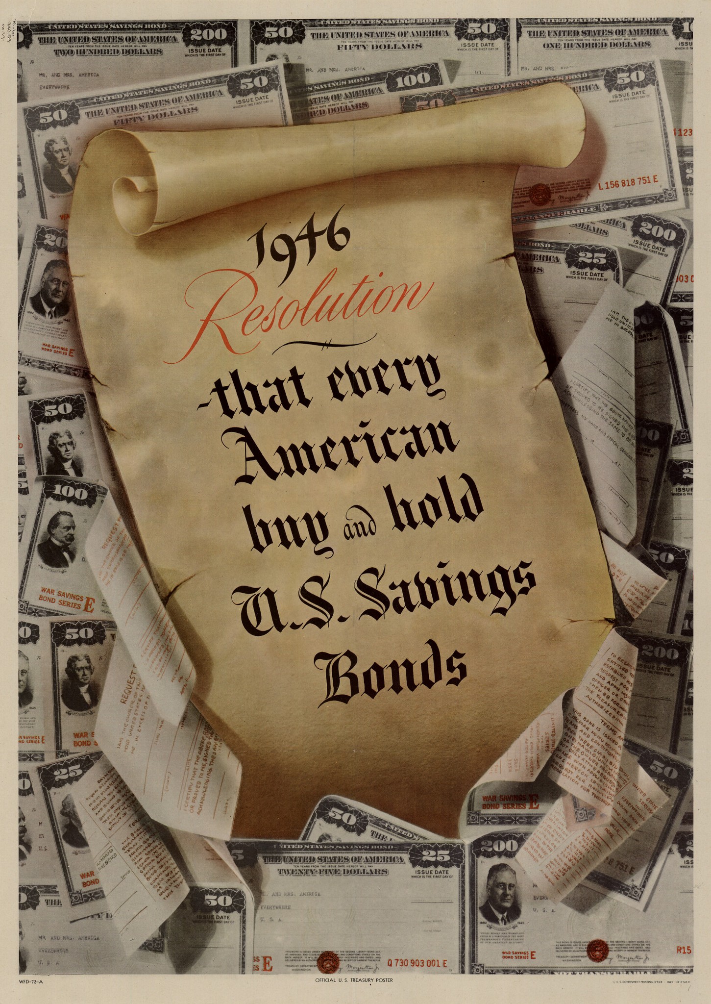 United States. War Finance Division. 1946 resolution: that every American buy and hold U.S. savings bonds., poster, 1945; [Washington D.C.]. (digital.library.unt.edu/ark:/67531/metadc474/m1/1/: accessed November 25, 2024), University of North Texas Libraries, UNT Digital Library, digital.library.unt.edu; crediting UNT Libraries Government Documents Department.