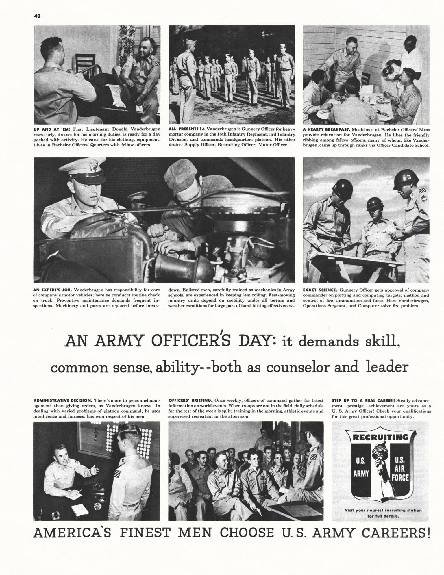 1949 An Army Officer's Day. it demans skill, common sense, ability -- both as counselor and leader. America's Finest Men Choose U.S. Army Careers!