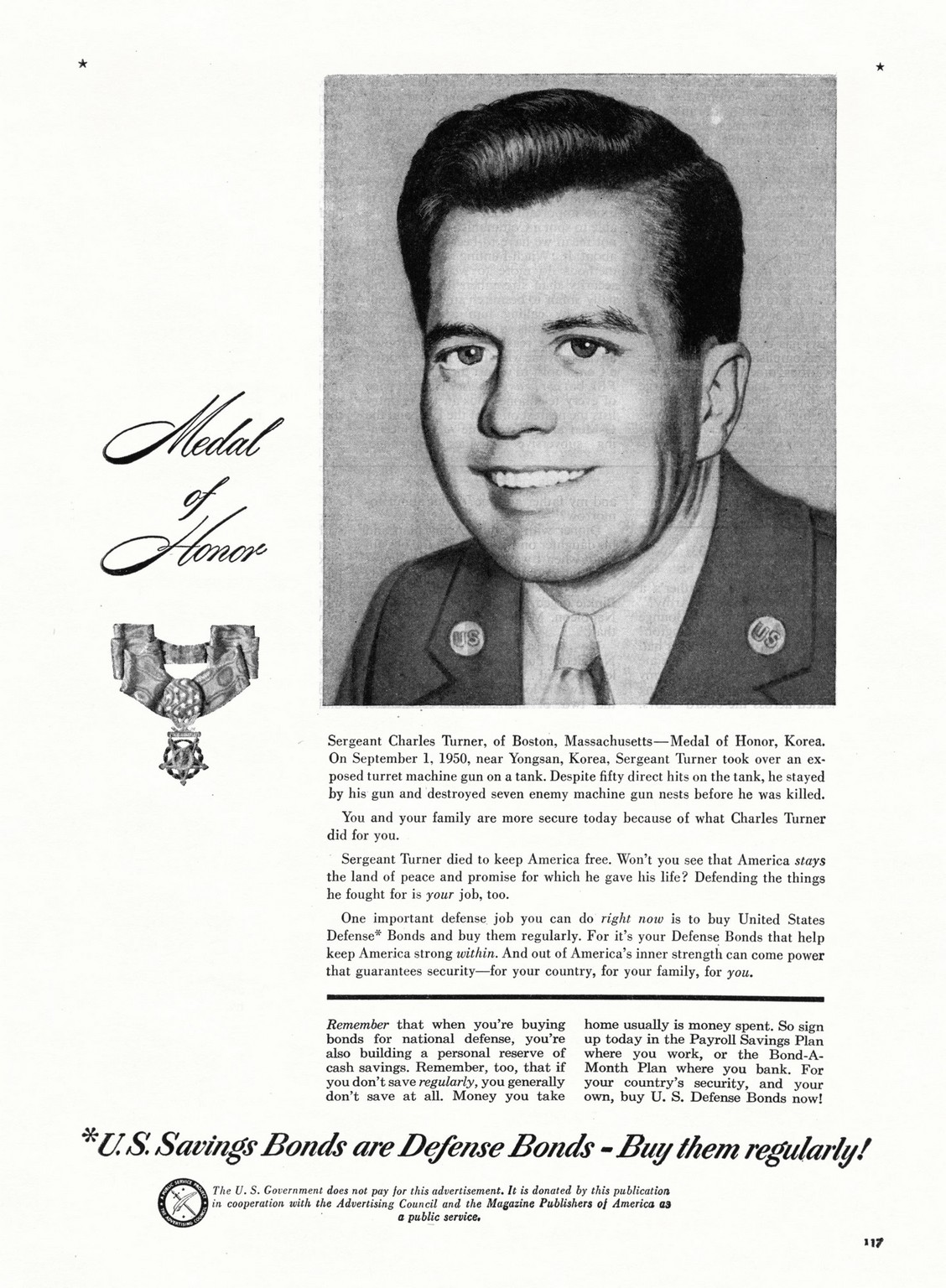 1951 Medal of Honor. Sergeant Charles Turner. U.S. Savings Bonds