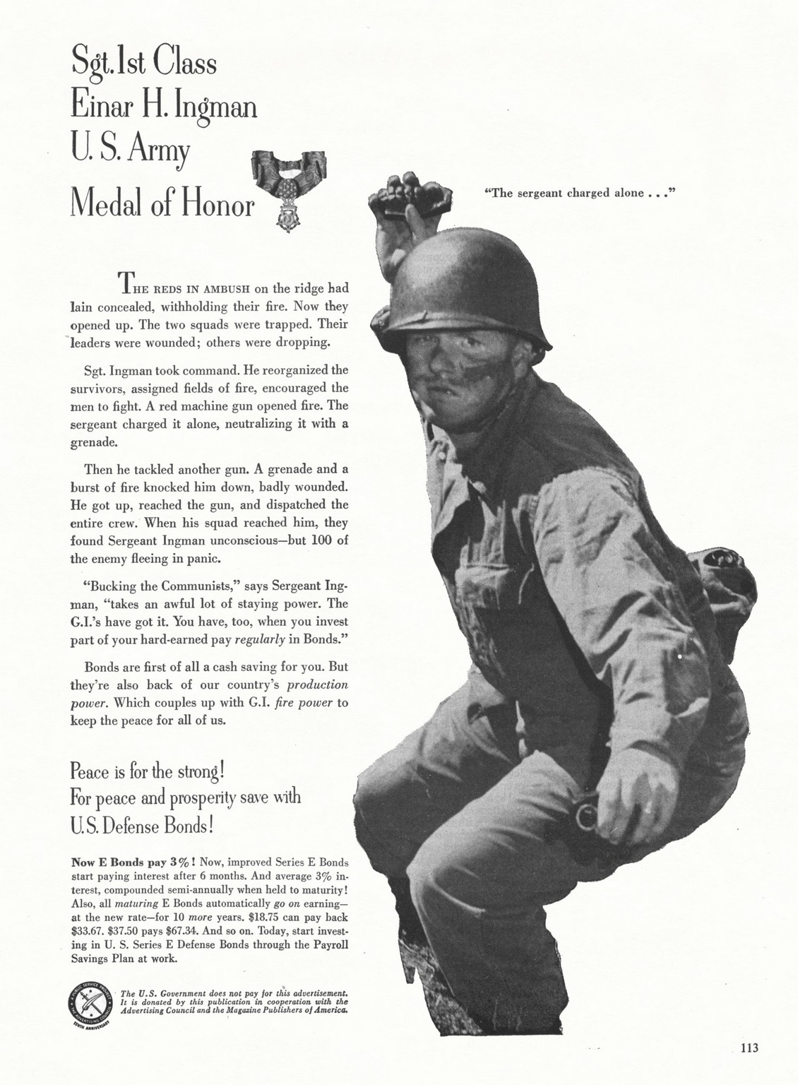 1953 Sgt.1st Class Einar H. Ingman. U.S. Army Medal of Honor. U.S. Defense Bonds!