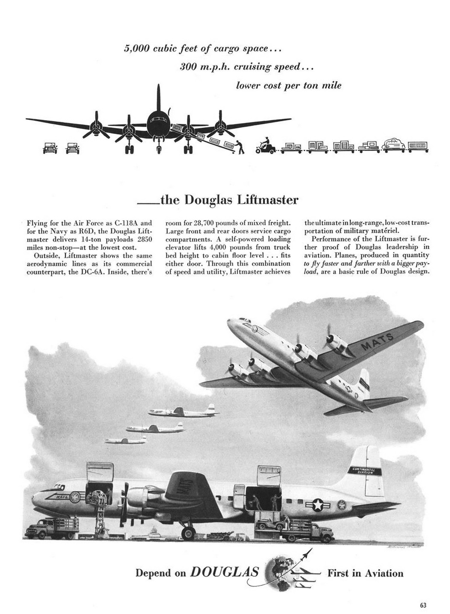 1953 5,000 cubic feet of cargo space… 300 m.p.h cruising speed…. lower cost per ton mile – the Douglas Liftmaster