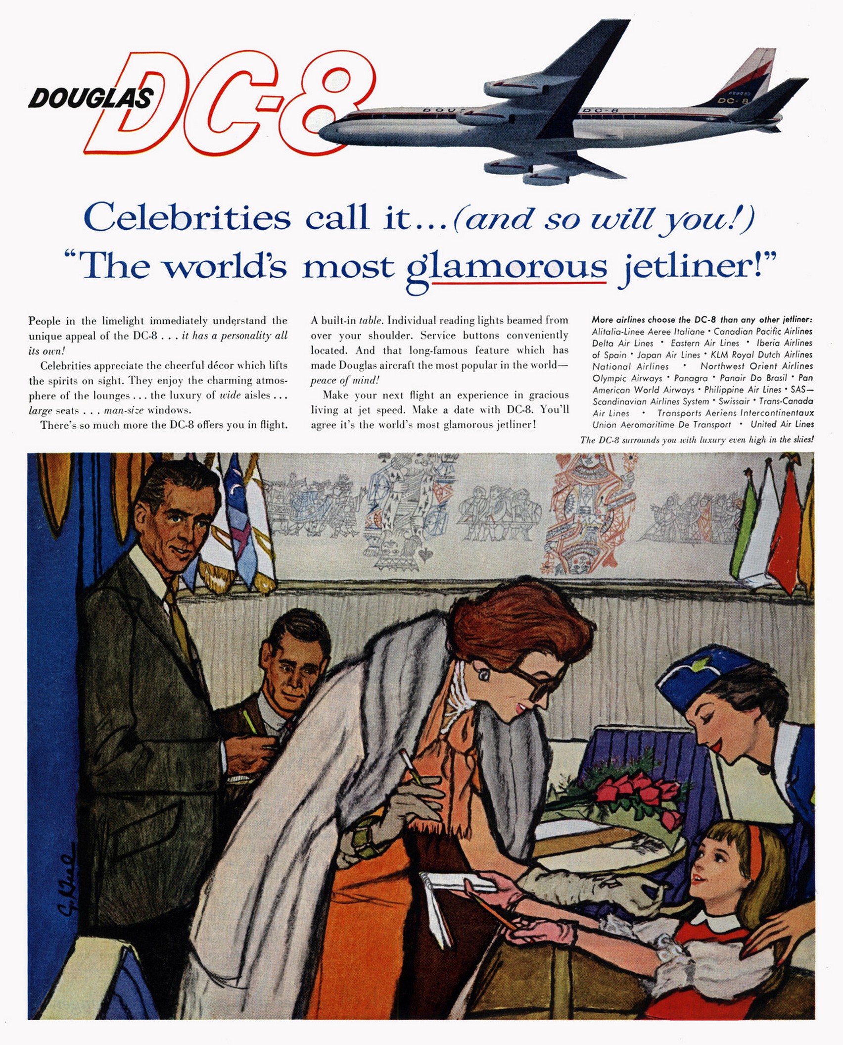 1960 Douglas DC-8. Celebrities call it … (and so will you!) ‘The world’s most glamorous jetliner!’
