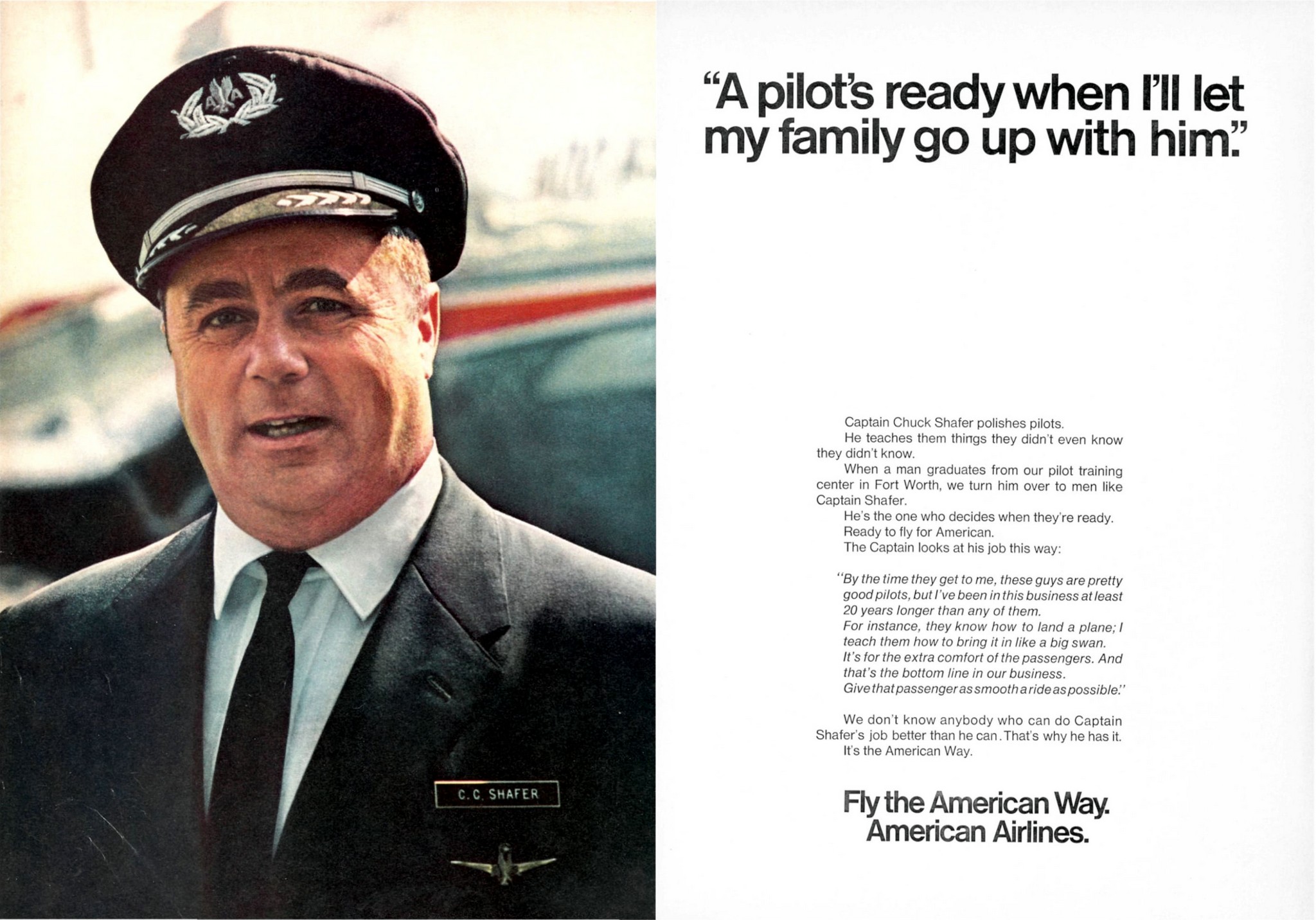 1968 ‘A pilot’s ready when I’ll let my family to go up with him.’ Fly the American Way. American Airlines