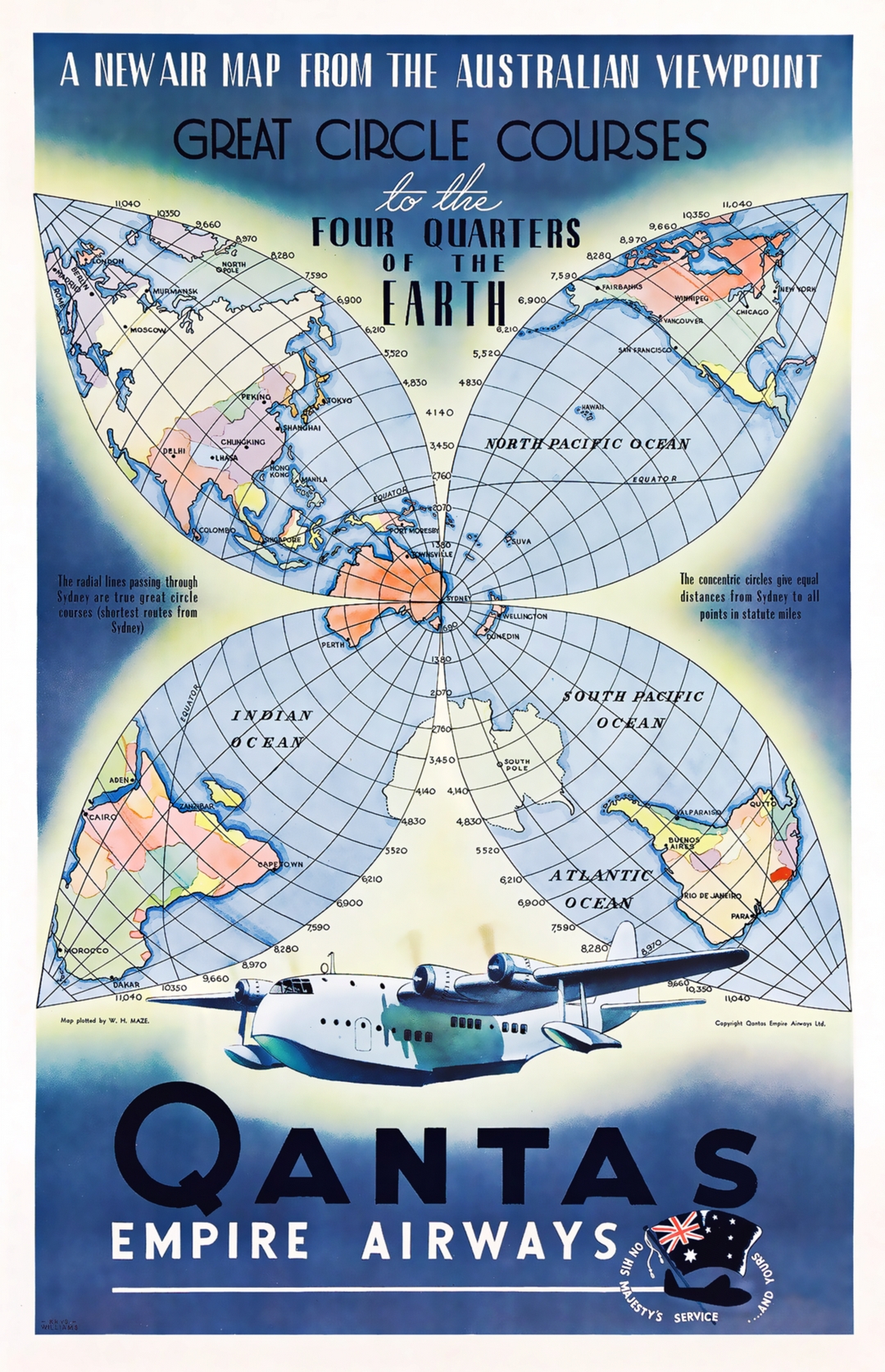 1938 A New Air Map From The Australian Viewpoint. Great Circle Courses to the Four Quarters of the Earth. Qantas