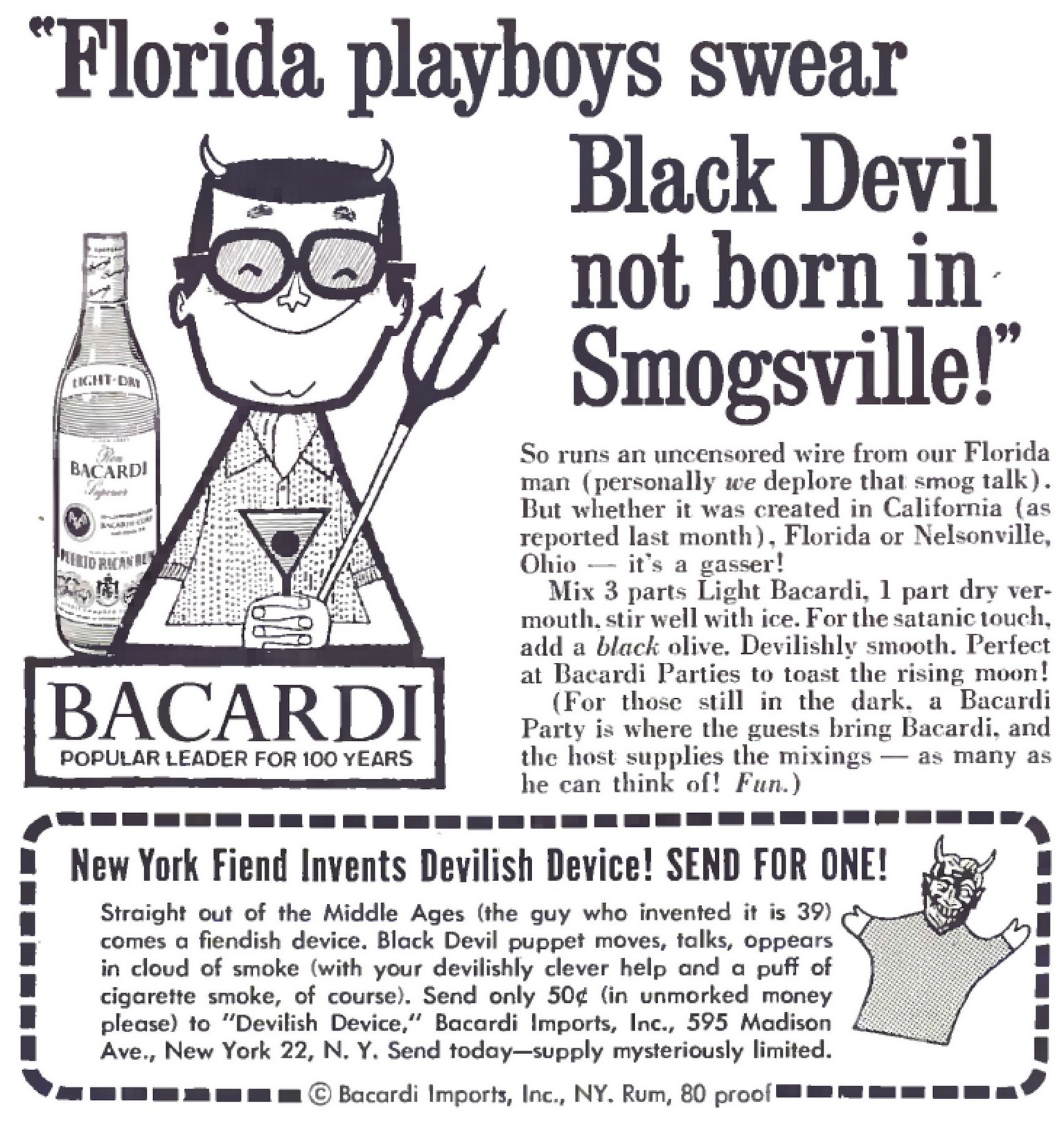 1962 'Florida playboys swear Black Devil not born in Smogsville!' Bacardi