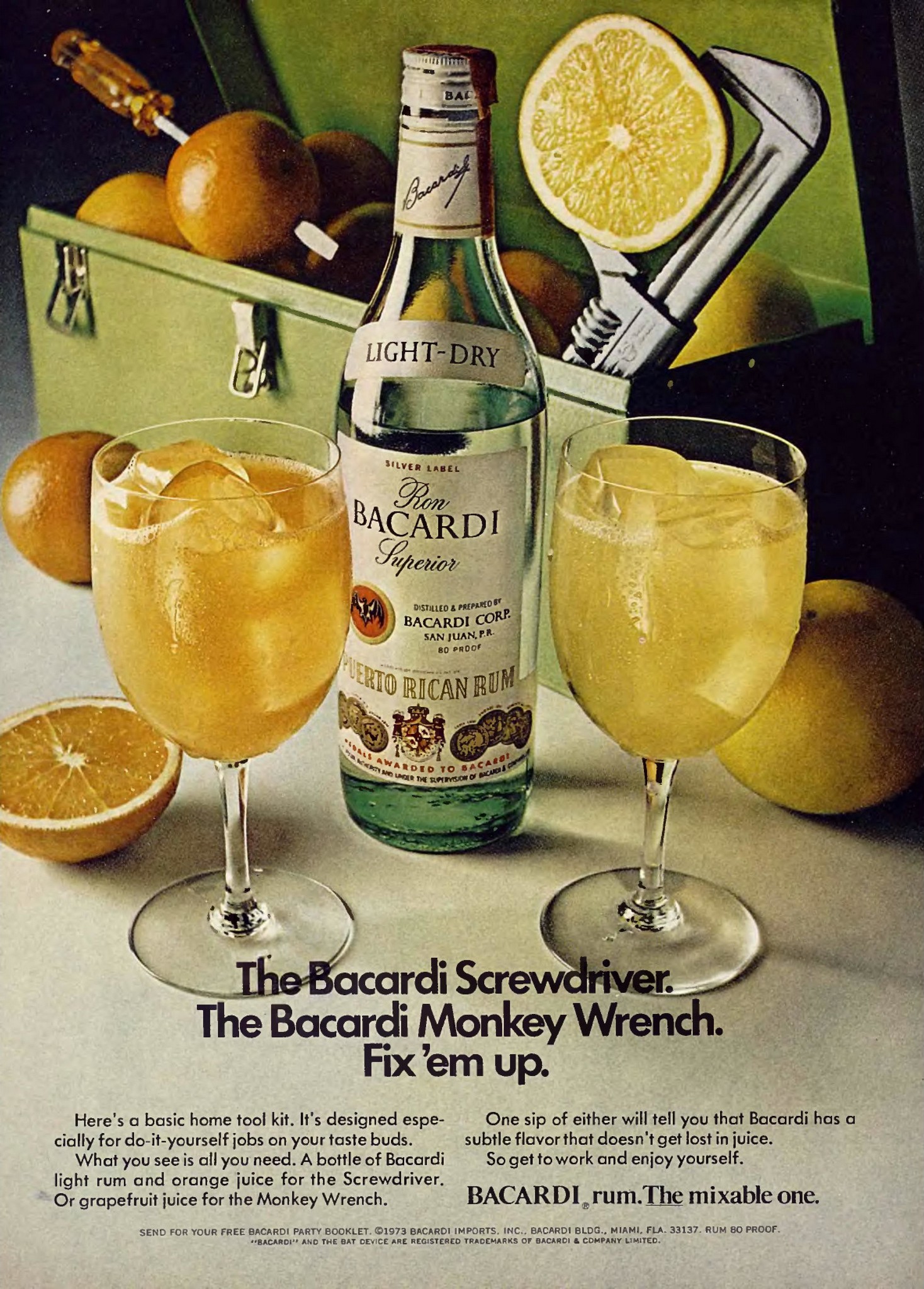 1973 The Bacardi Screwdriver. The Bacardi Monkey Wrench. Fix ’em up