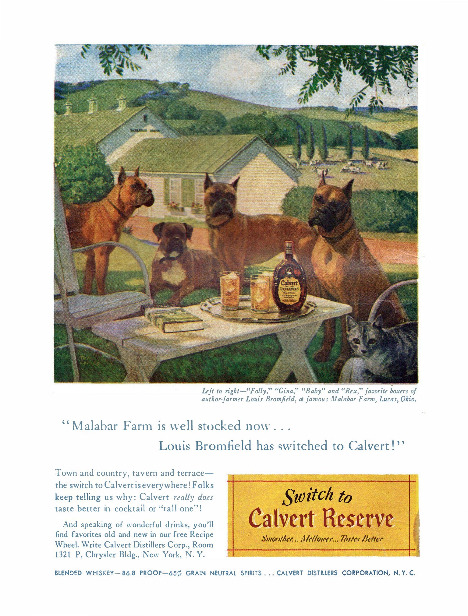 1949 ‘Malabar Farm is well stocked now… Louis Bromfield has switched to Calvert!’