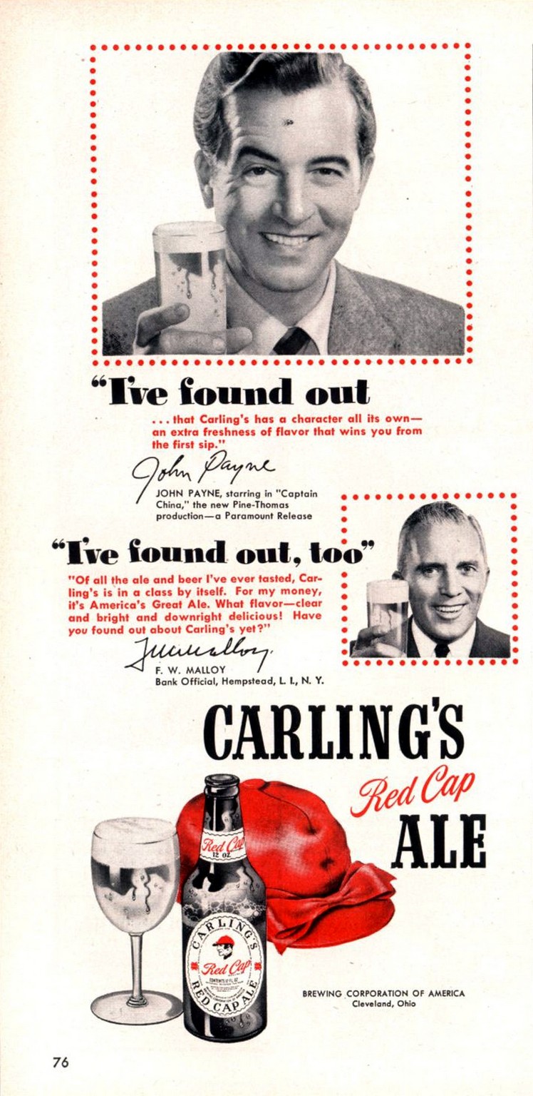 1950 I’ve found out. John Payne and I’ve found out, too. F.W. Malloy. Carling’s Red Cap Ale