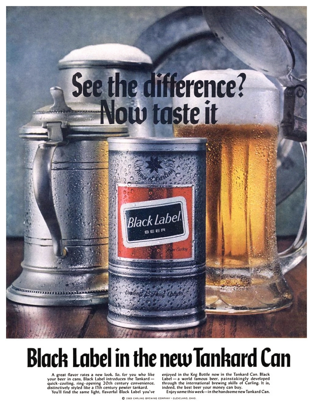 1969 See the difference. Now taste it. Black Label in the new Tankard Can. Carling