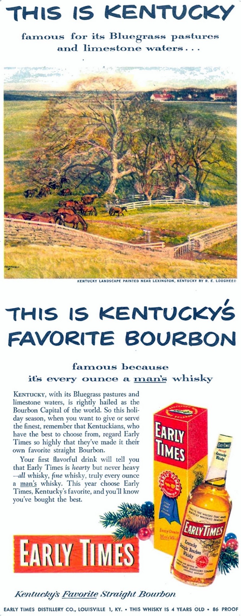 1951 This Is Kentucky, famous for its Bluegrass pastures and limestone waters … This is Kentucky’s Favorite Bourbon, famous because it’s every ounce a man’s whisky. Early Times