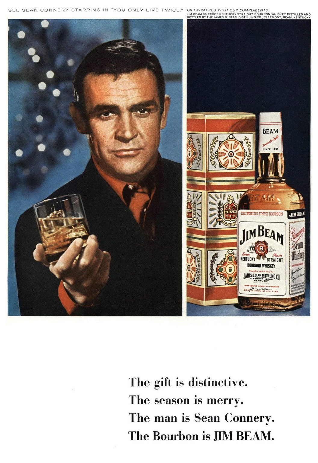 1966 The gift is distinctive. The season is merry. The man is Sean Connery. The Bourbon is Jim Beam