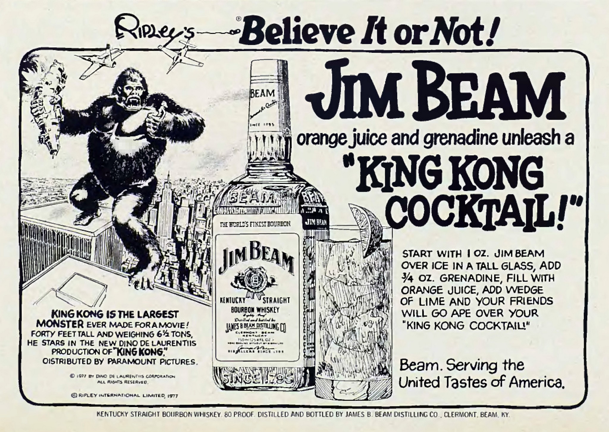 1977 Ripley's Believe It or Not! Jim Beam orange juice and grenadine unleash a 'King Kong Cocktail!'