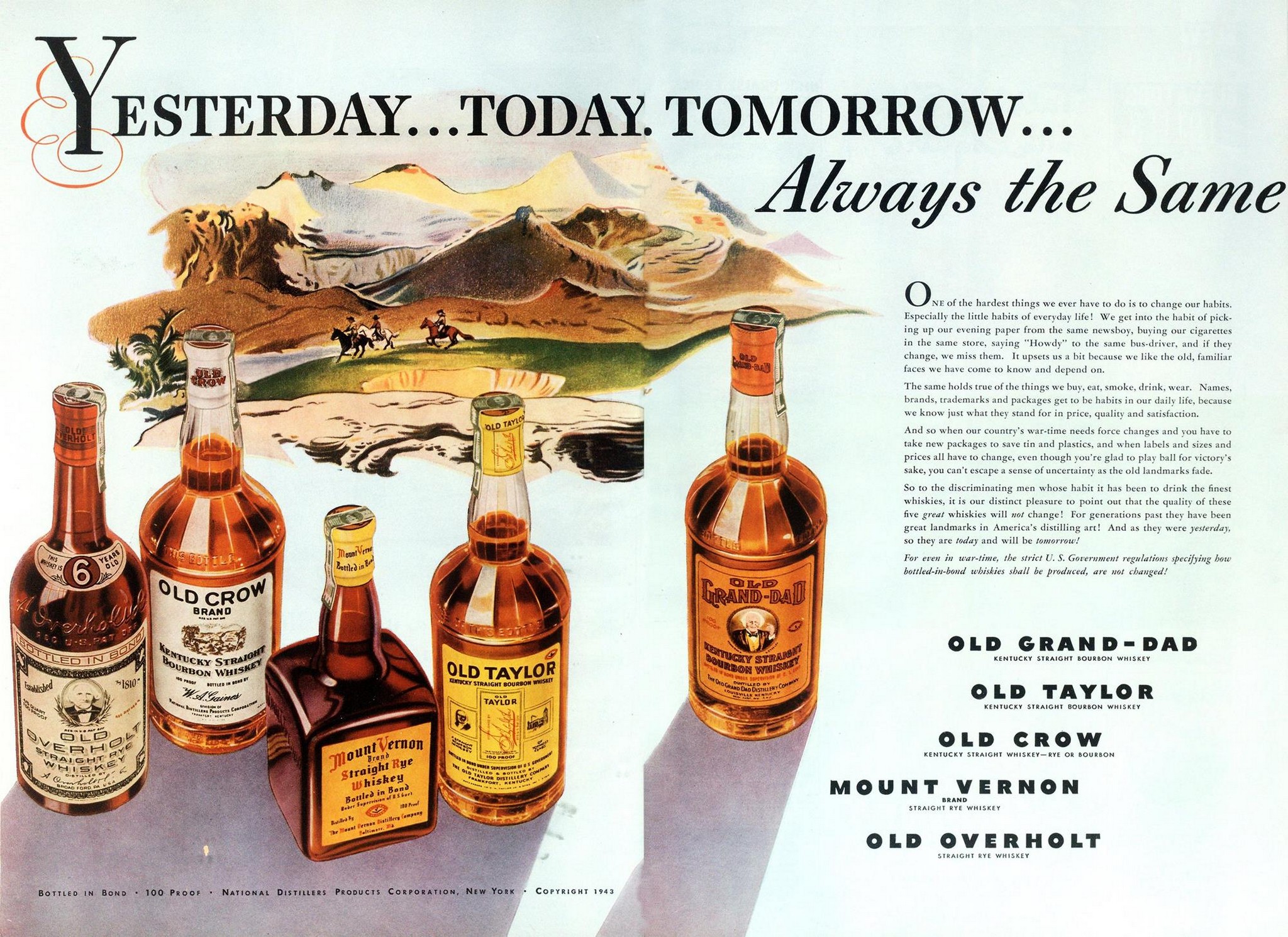 1943 Yesterday… Today. Tomorrow… Always the Same. Old Grand-Dad, Old Taylor, Old Crow, Mount Vernon, Old Overholt