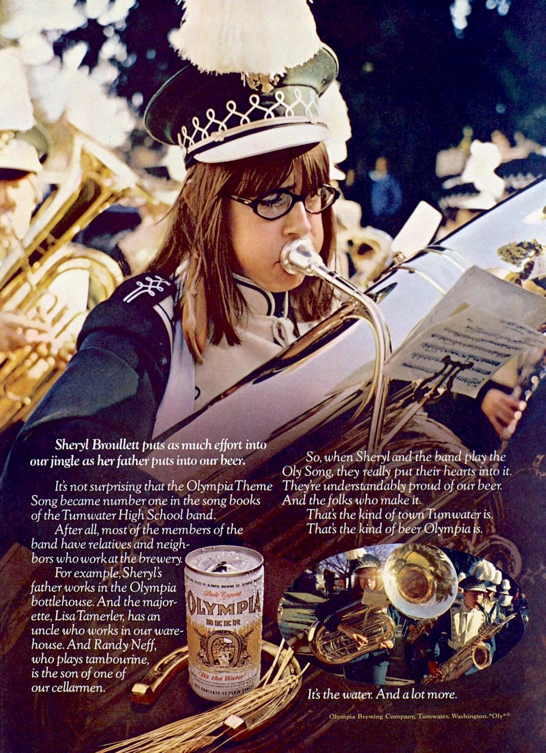 1973 Sheryl Broullett puts as much effort into our jingle as her father puts into our beer. Olympia Beer