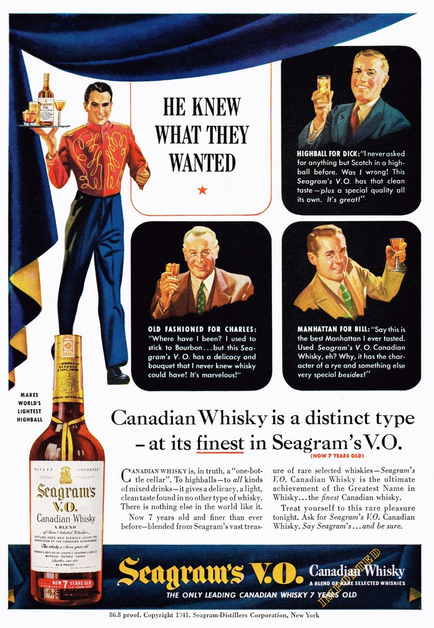 1941 He Knew What They Wanted. Canadian Whisky is a distinct type – at its fines in Seagram’s V.O.