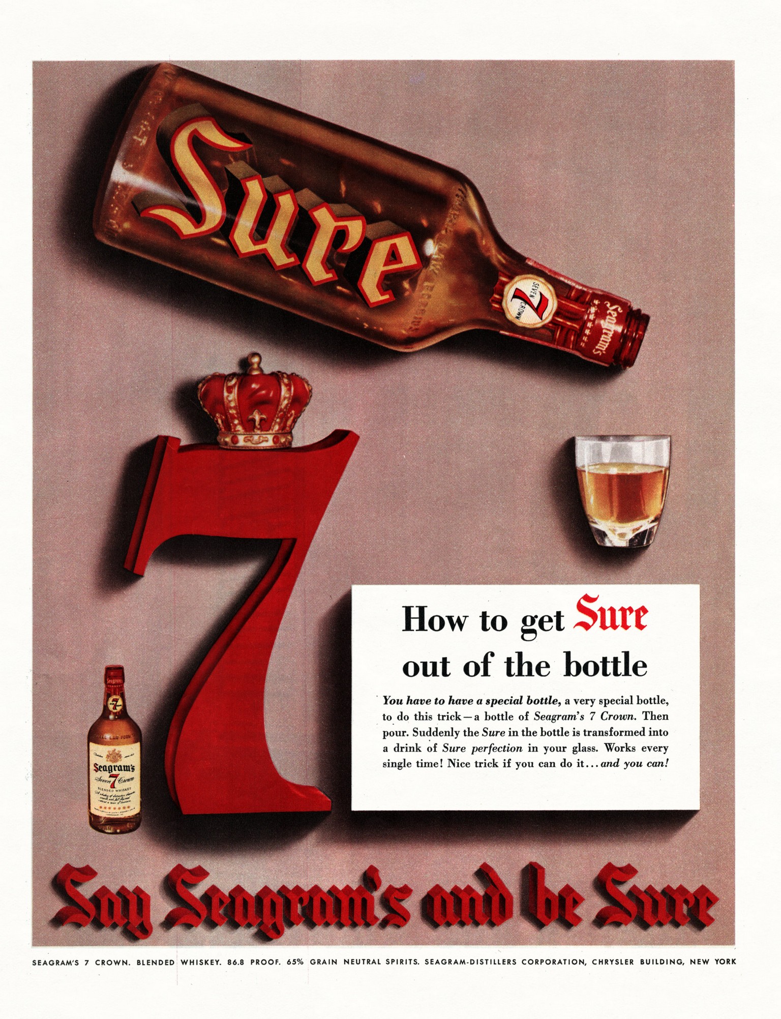 1952 How to get Sure out of the bottle. Say Seagram’s and be Sure