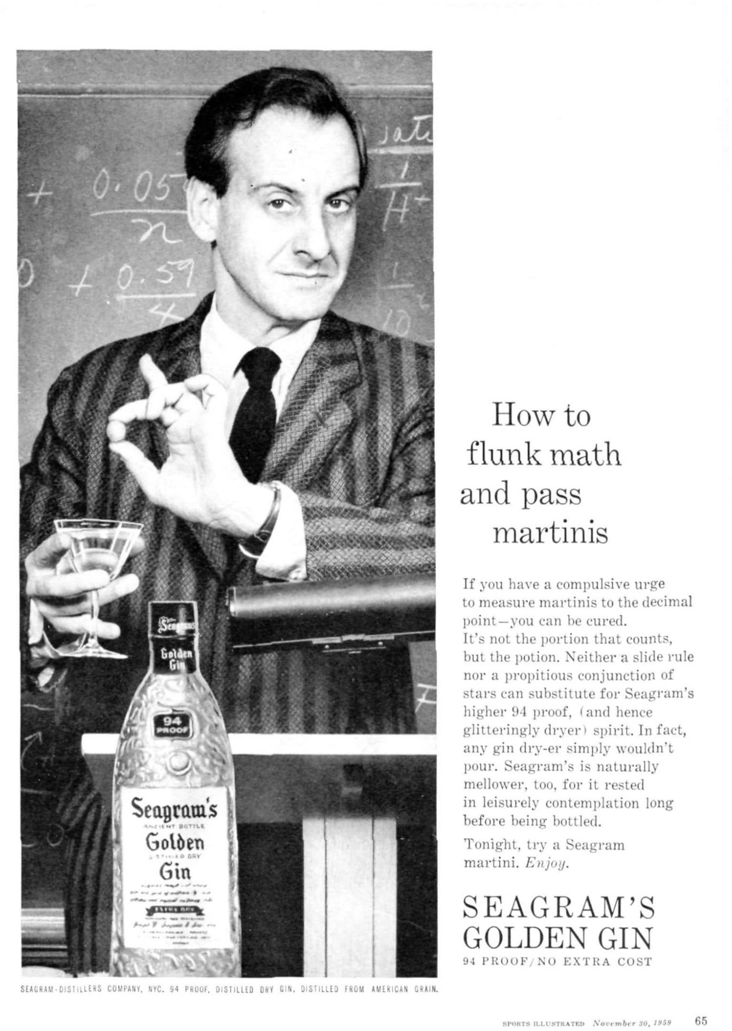 1959 How to flunk math and pass martinis. Seagram’s Golden Gin