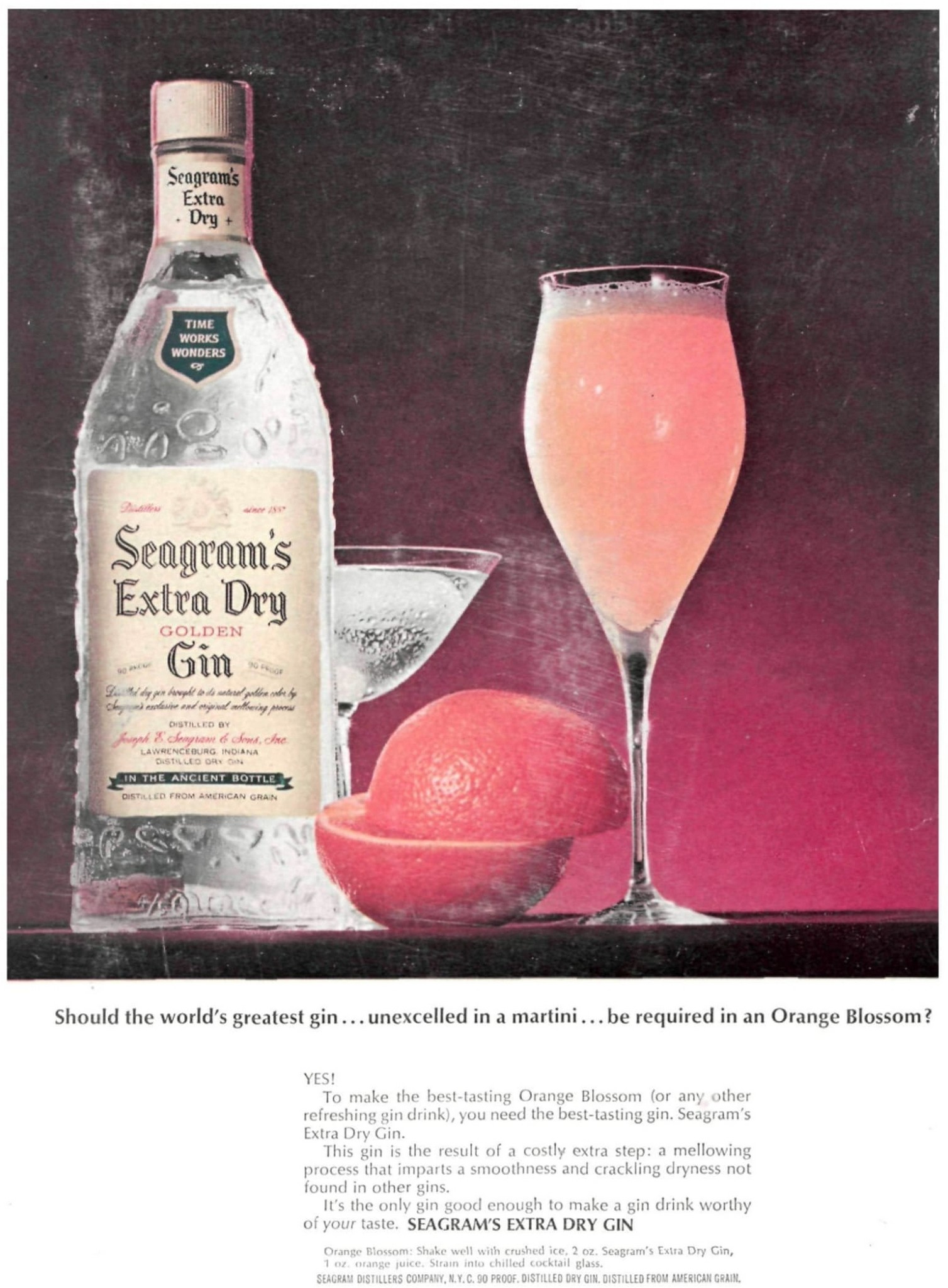 1963 Should the world’s greatest gin… unexcelled in a martin… be required in an Orange Blossom. Seagram’s