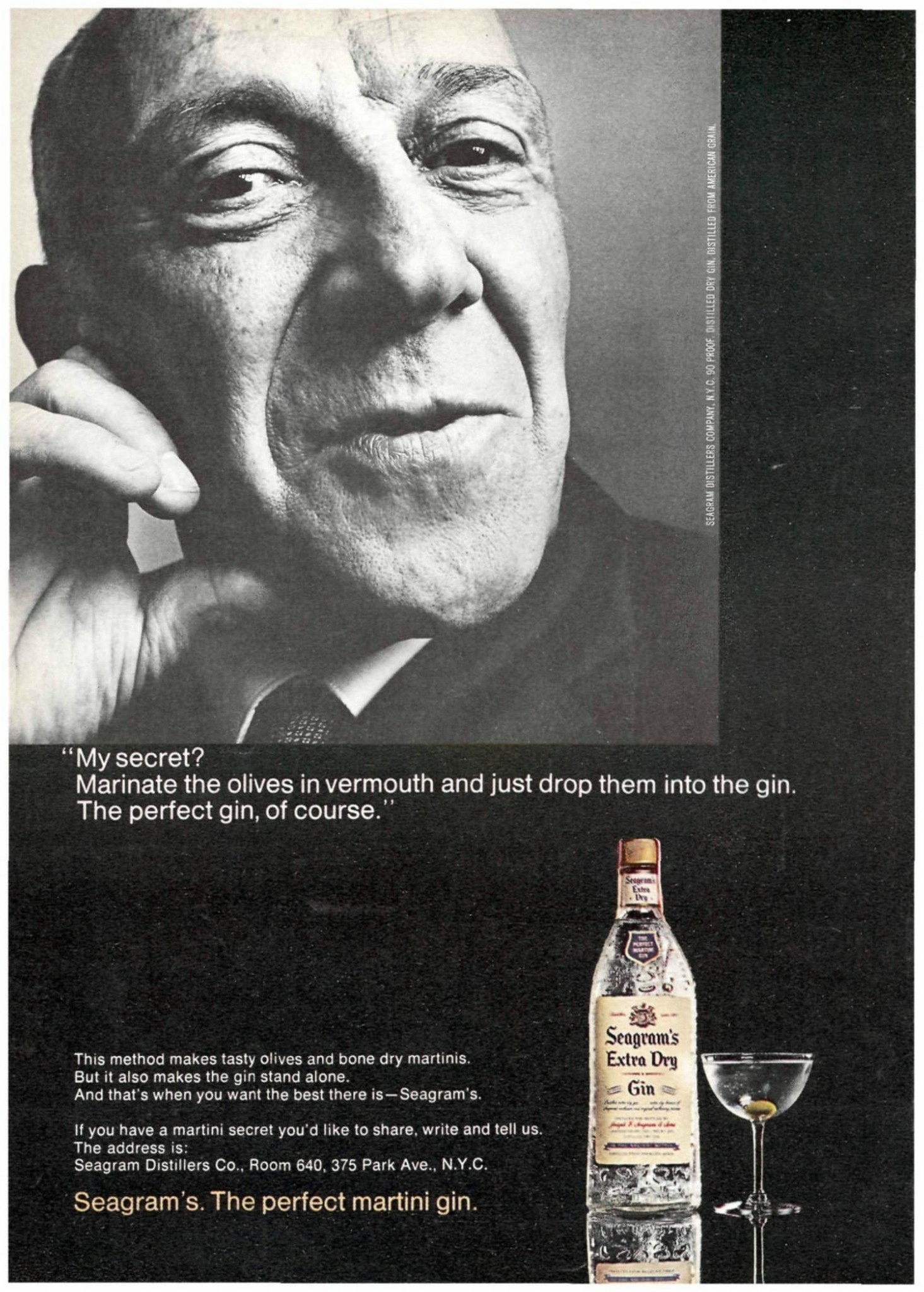 1968 'My secret' Marinate the olives in vermouth and just drop them into the gin. The perfect gin, of course.' Seagram's