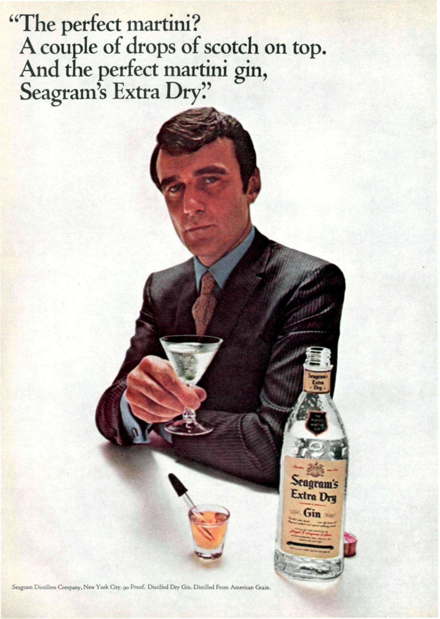 1969 ‘The perfect martini. A couple of drops of scotch on the top.. And a perfect martini gin, Seagram’s Extra Dry.’