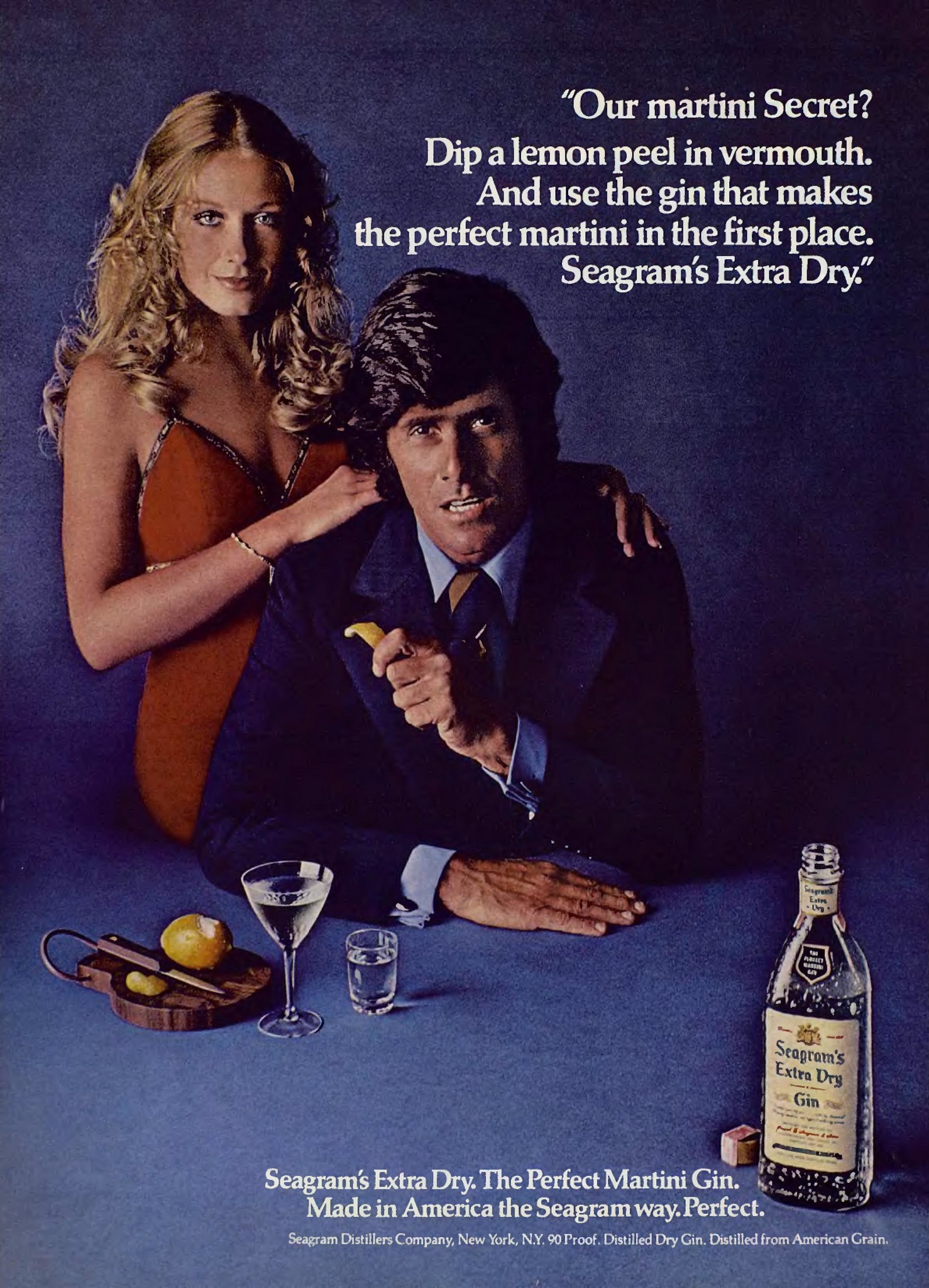 1972 ‘Our martini Secret. Dip a lemon peel in vermouth. And use the gin that makes the perfect martini in the first place. Seagram’s Extra Dry.’
