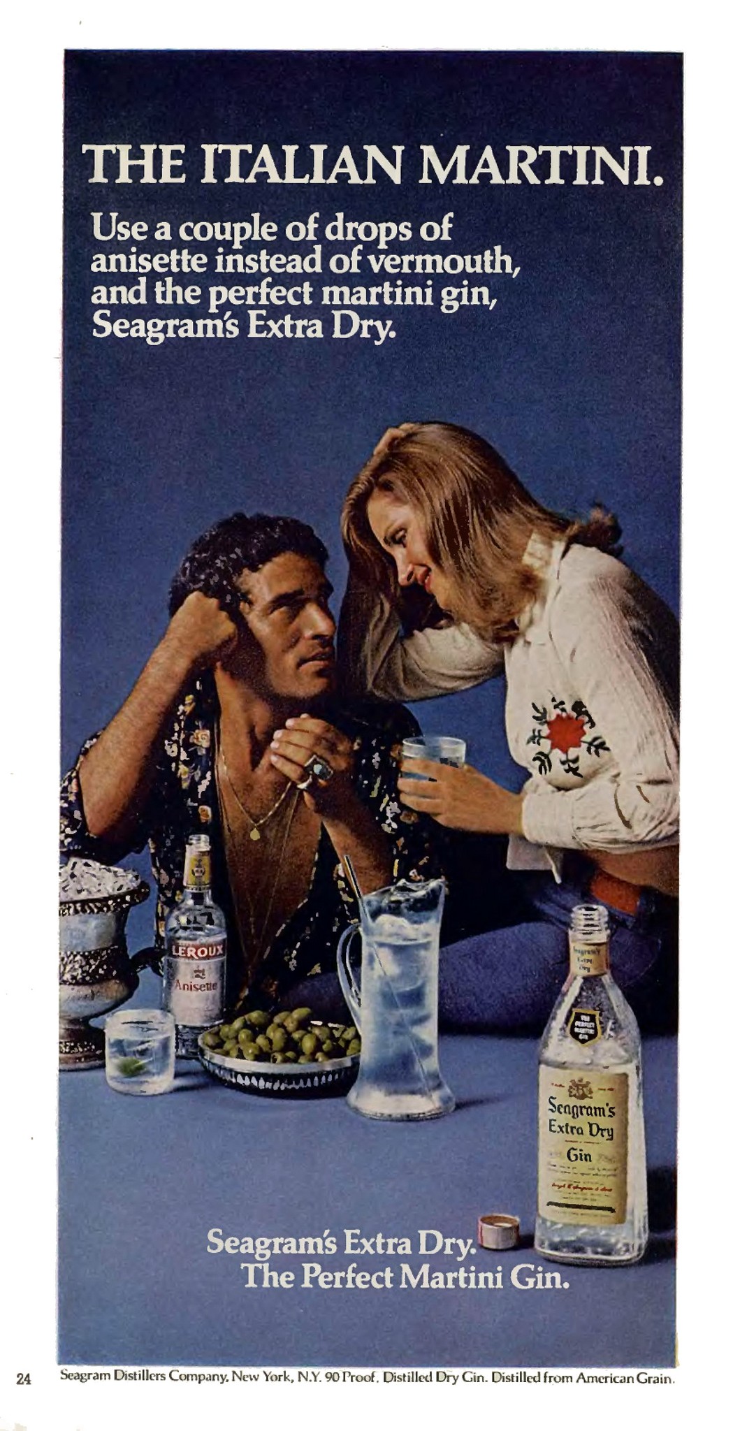 1973 The Italian Martini. Use a couple of drops of anisette instead of vermouth, and the perfect martini gin, Seagram’s Extra Dry