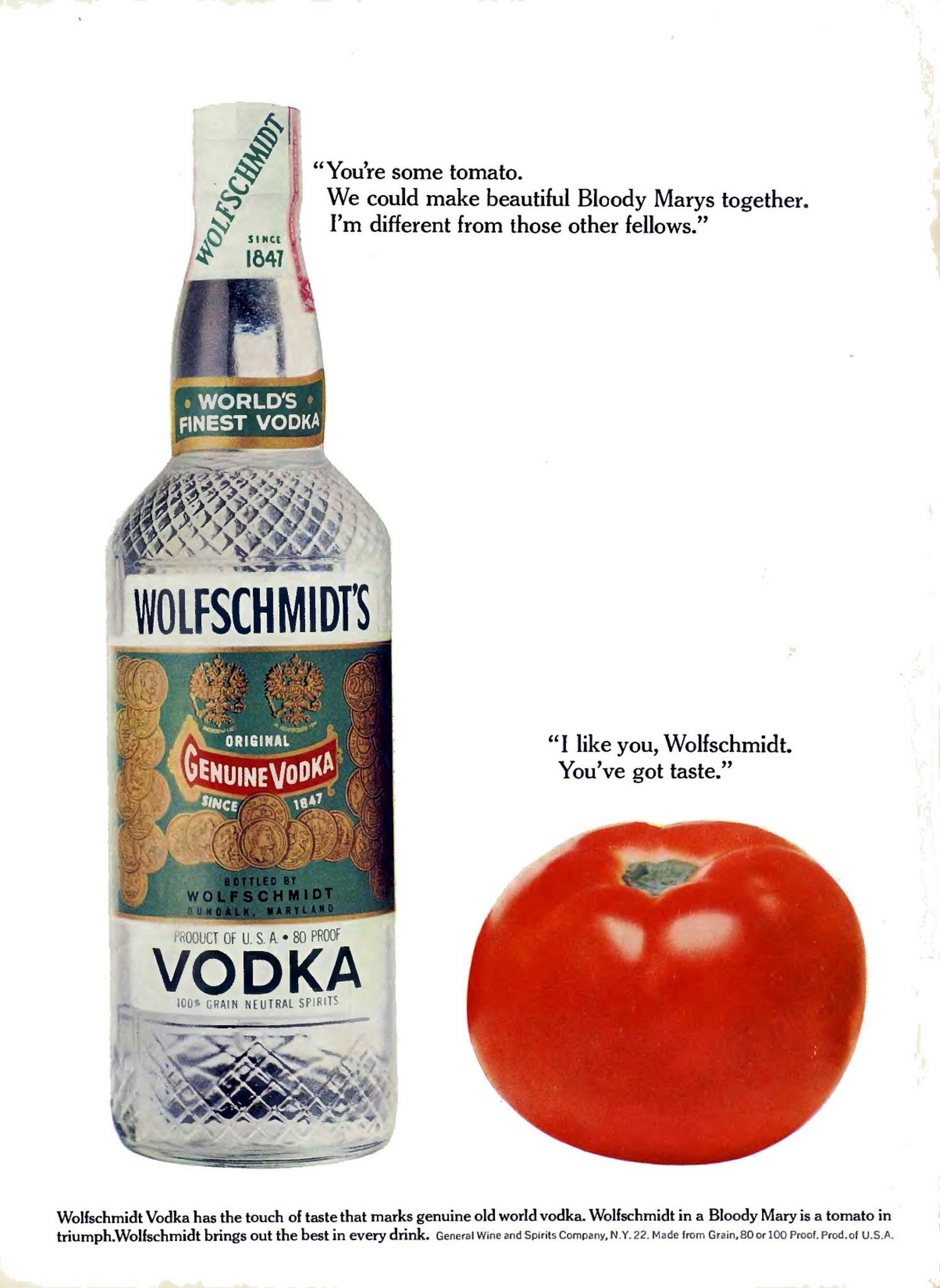 1961 Wolfschmidt's Vodka. 'You're some tomato. We could make beautiful Bloody Marys together. I'm different from those other fellows