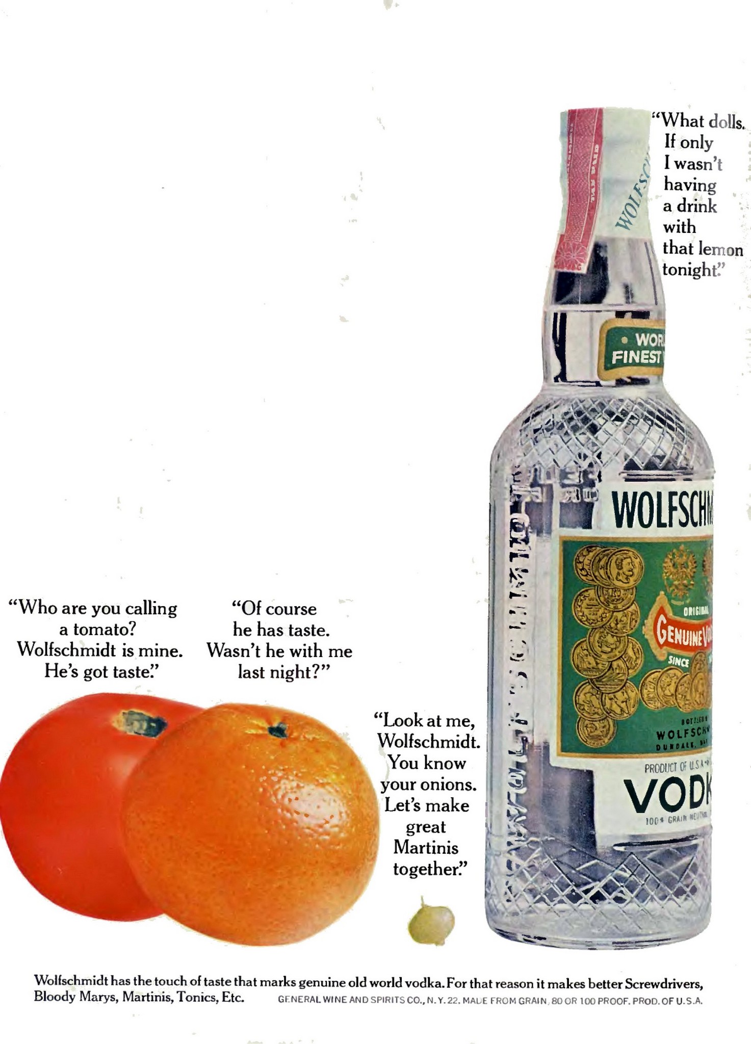 1962 Volfschmidt's Vodka. 'Look at me Wolfschmidt. You know your onions. Let's make great Martinis together'