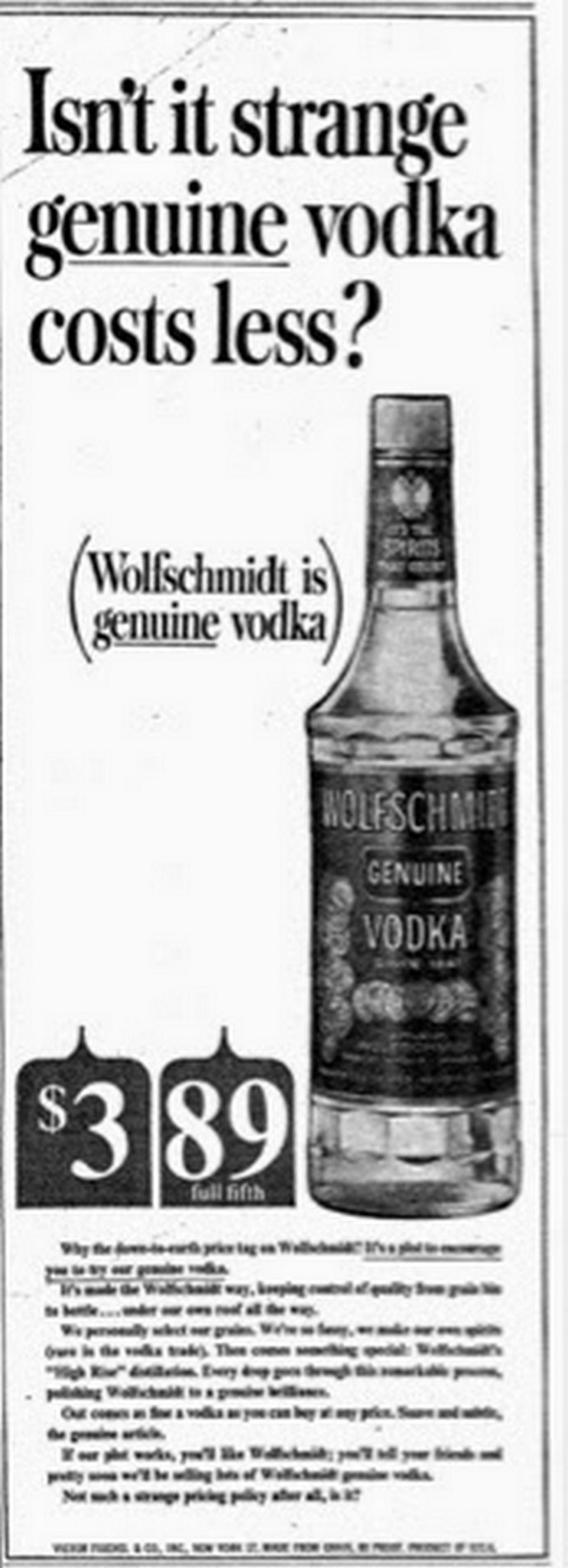 1964 Isn’t it strange genuine vodka costs less. (Wolfschmidt is genuine vodka)