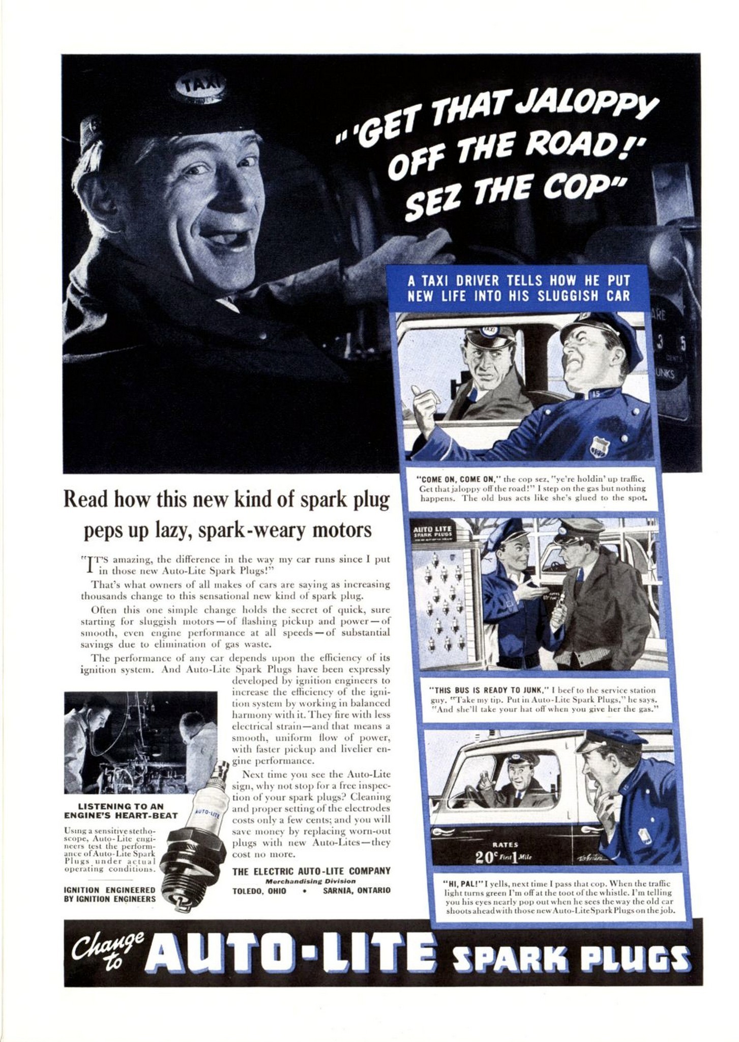1940 ‘Get That Jaloppy Off The Road!’ Sez The Cop’ Change to Auto-Lite Spark Plugs